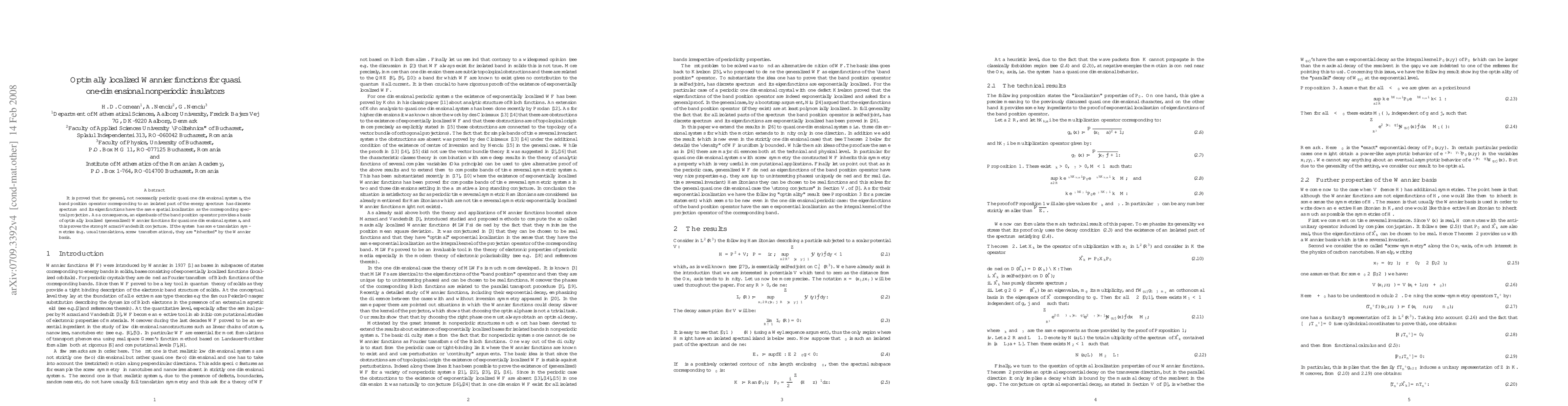 This paper proves the existence of optimally localized Wannier functions for quasi one-dimensional nonperiodic insulators, demonstrating that eigenfunctions of the band position operator exhibit the same spatial localization as their corresponding spectral projections. This validates the "strong conjecture" of Marzari and Vanderbilt and shows that translation symmetries in the system are preserved in the Wannier basis.