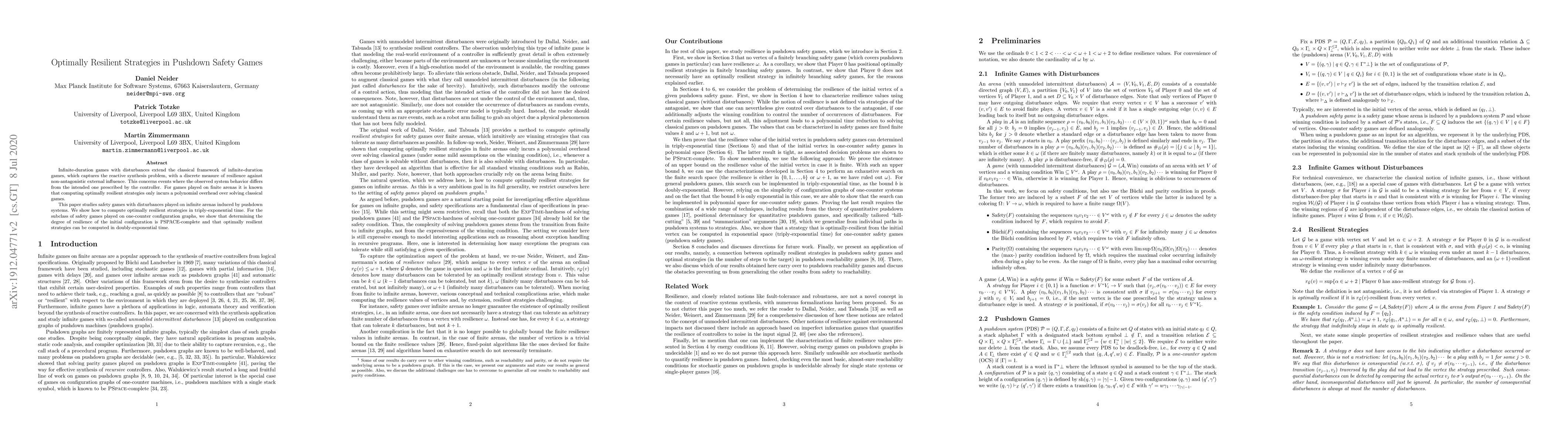 This paper investigates optimally resilient strategies for safety games with disturbances on infinite arenas modeled by pushdown systems. It demonstrates how to compute these strategies in triply-exponential time, and for one-counter configuration graphs, it proves PSPACE-completeness for resilience determination and doubly-exponential time for computing optimal resilient strategies.