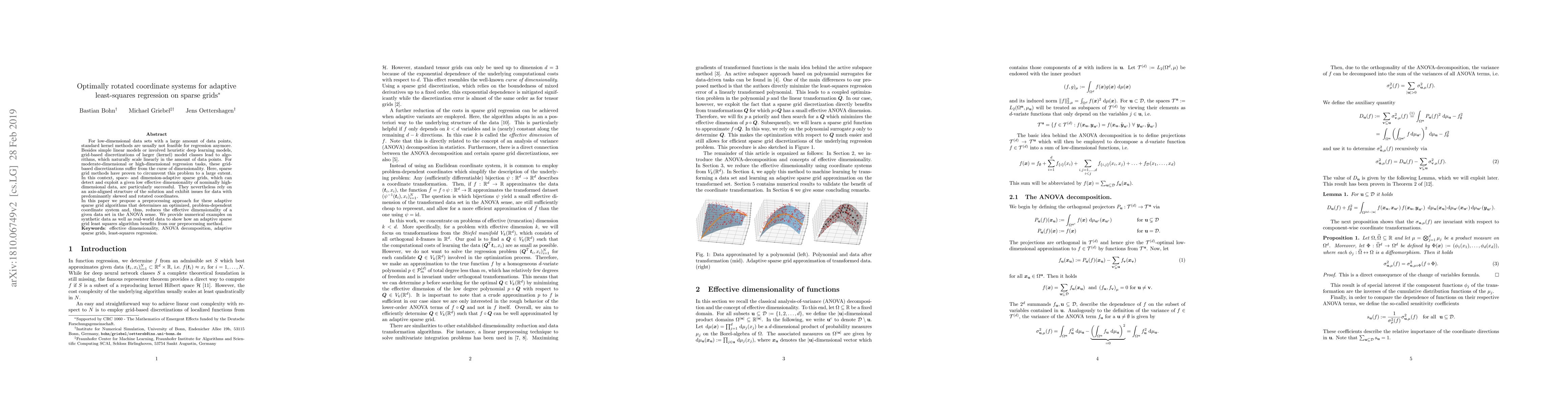 For low-dimensional data sets with a large amount of data points, standard kernel methods are usually not feasible for regression anymore. Besides simple linear models or involved heuristic deep learning models, grid-based discretizations of larger (kernel) model classes lead to algorithms, which naturally scale linearly in the amount of data points. For moderate-dimensional or high-dimensional regression tasks, these grid-based discretizations suffer from the curse of dimensionality. Here, sparse grid methods have proven to circumvent this problem to a large extent. In this context, space- and dimension-adaptive sparse grids, which can detect and exploit a given low effective dimensionality of nominally high-dimensional data, are particularly successful. They nevertheless rely on an axis-aligned structure of the solution and exhibit issues for data with predominantly skewed and rotated coordinates. In this paper we propose a preprocessing approach for these adaptive sparse grid algorithms that determines an optimized, problem-dependent coordinate system and, thus, reduces the effective dimensionality of a given data set in the ANOVA sense. We provide numerical examples on synthetic data as well as real-world data to show how an adaptive sparse grid least squares algorithm benefits from our preprocessing method.