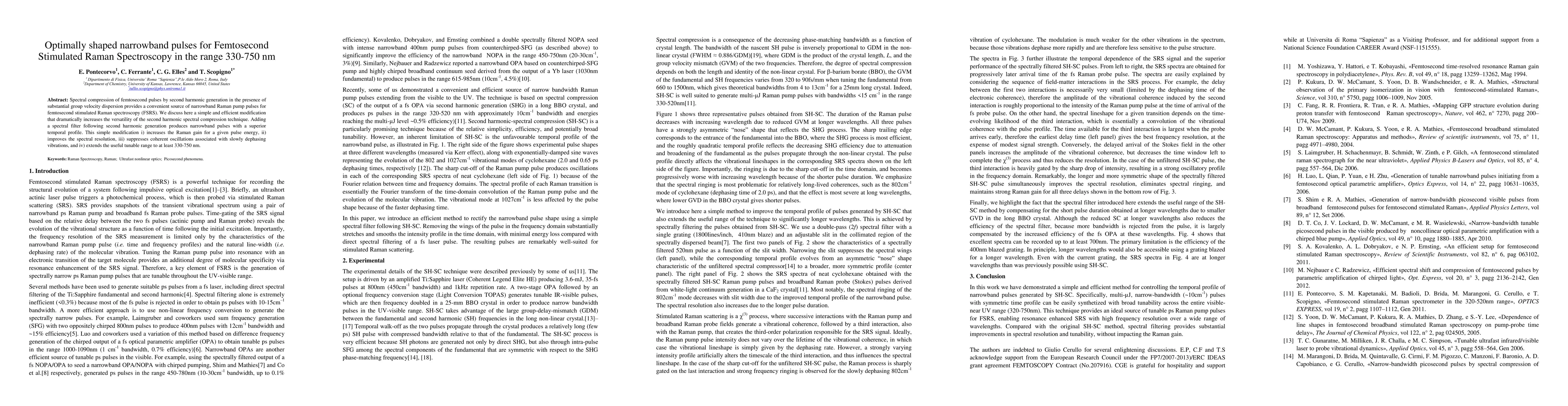 Spectral compression of femtosecond pulses by second harmonic generation in the presence of substantial group velocity dispersion provides a convenient source of narrowband Raman pump pulses for femtosecond stimulated Raman spectroscopy (FSRS). We discuss here a simple and efficient modification that dramatically increases the versatility of the second harmonic spectral compression technique. Adding a spectral filter following second harmonic generation produces narrowband pulses with a superior temporal profile. This simple modification i) increases the Raman gain for a given pulse energy, ii) improves the spectral resolution, iii) suppresses coherent oscillations associated with slowly dephasing vibrations, and iv) extends the useful tunable range to at least 330-750 nm.
