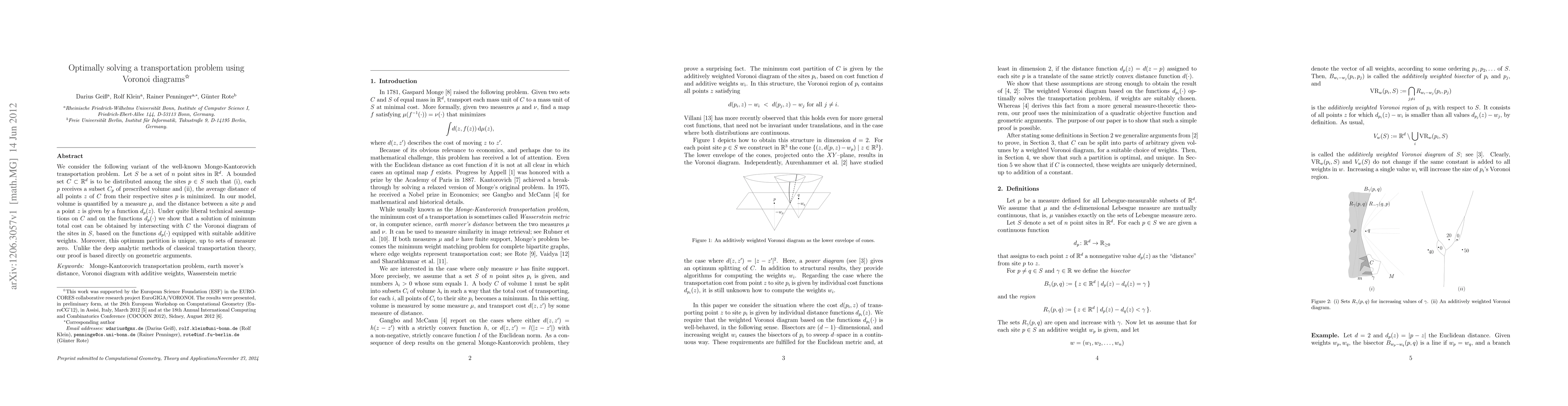 We consider the following variant of the Monge-Kantorovich transportation problem. Let S be a finite set of point sites in d dimensions. A bounded set C in d-dimensional space is to be distributed among the sites p in S such that (i) each p receives a subset C_p of prescribed volume, and (ii) the average distance of all points of C from their respective sites p is minimized. In our model, volume is quantified by some measure, and the distance between a site p and a point z is given by a function d_p(z). Under quite liberal technical assumptions on C and on the functions d_p we show that a solution of minimum total cost can be obtained by intersecting with C the Voronoi diagram of the sites in S, based on the functions d_p with suitable additive weights. Moreover, this optimum partition is unique up to sets of measure zero. Unlike the deep analytic methods of classical transportation theory, our proof is based directly on geometric arguments.