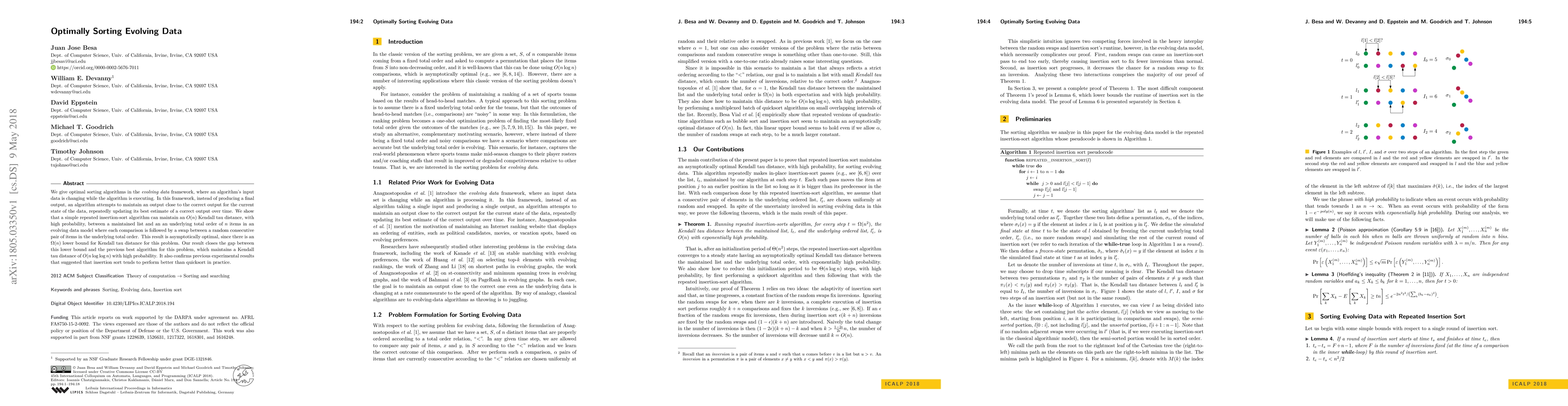 A repeated insertion-sort algorithm maintains an O(n) Kendall tau distance with high probability in evolving data, improving upon a previous bound of O(n log log n). This achievement confirms experimental results suggesting insertion sort outperforms quicksort.