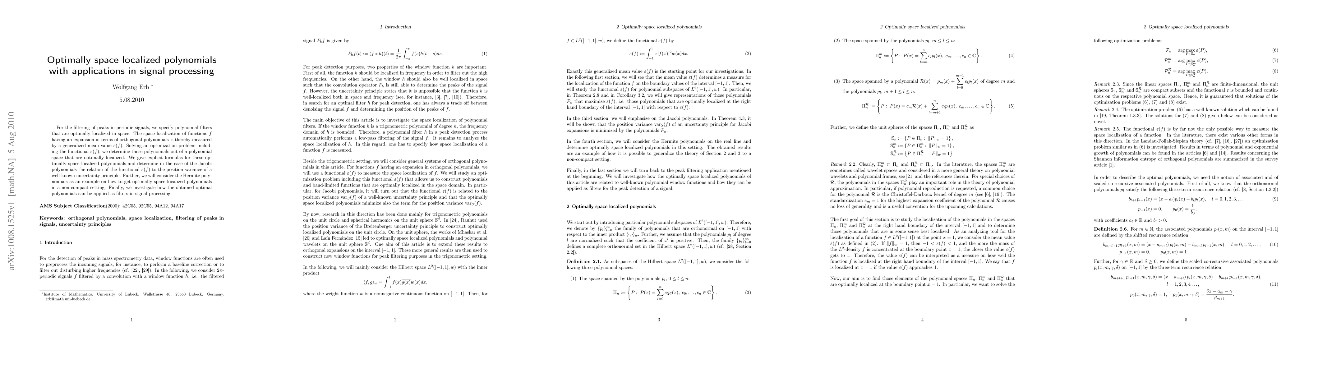 Researchers develop optimal space-localized polynomials for peak filtering in periodic signals, achieving better localization through a generalized mean value calculation. The methods can be applied to various polynomial spaces, including Jacobi and Hermite polynomials.