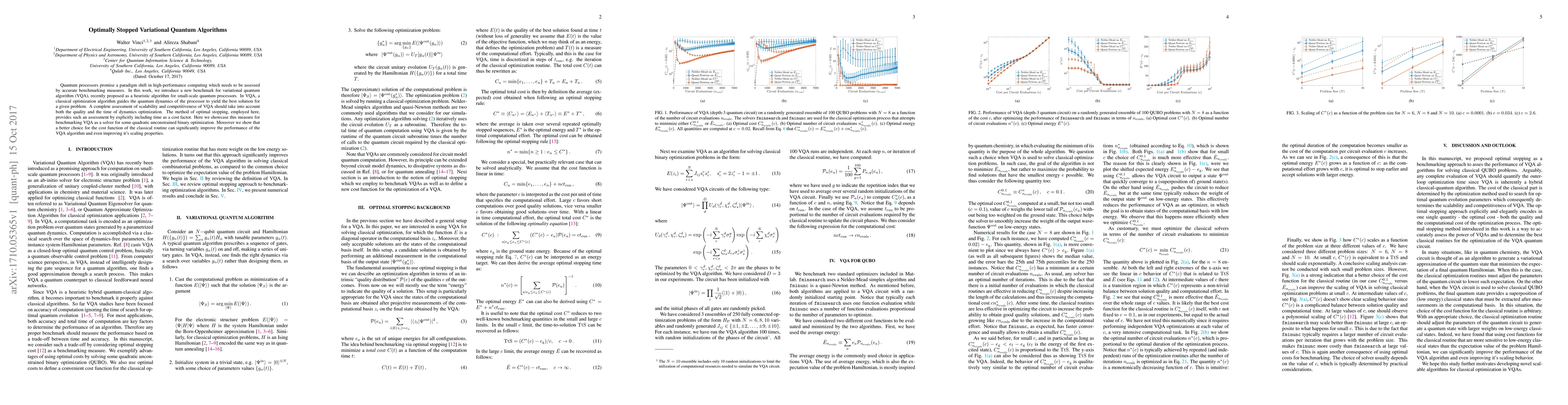 Quantum processors promise a paradigm shift in high-performance computing which needs to be assessed by accurate benchmarking measures. In this work, we introduce a new benchmark for variational quantum algorithm (VQA), recently proposed as a heuristic algorithm for small-scale quantum processors. In VQA, a classical optimization algorithm guides the quantum dynamics of the processor to yield the best solution for a given problem. A complete assessment of scalability and competitiveness of VQA should take into account both the quality and the time of dynamics optimization. The method of optimal stopping, employed here, provides such an assessment by explicitly including time as a cost factor. Here we showcase this measure for benchmarking VQA as a solver for some quadratic unconstrained binary optimization. Moreover we show that a better choice for the cost function of the classical routine can significantly improve the performance of the VQA algorithm and even improving it's scaling properties.