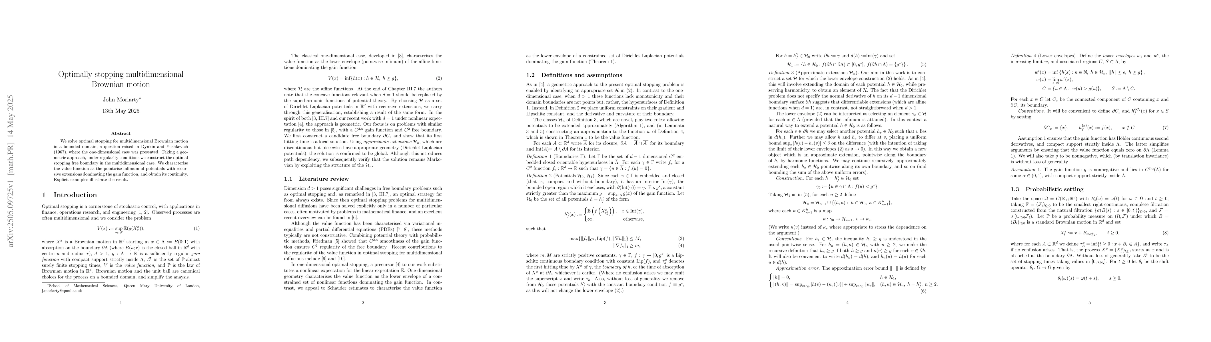 The paper employs a geometric approach to solve optimal stopping for multidimensional Brownian motion in a bounded domain, constructing the optimal stopping free boundary under regularity conditions.
