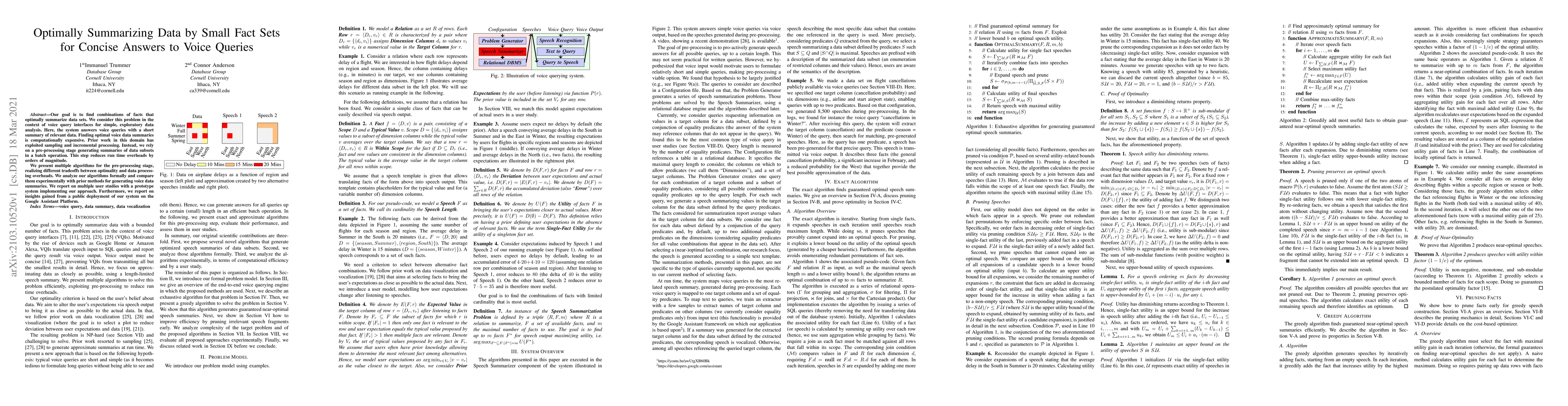 Our goal is to find combinations of facts that optimally summarize data sets. We consider this problem in the context of voice query interfaces for simple, exploratory data analysis. Here, the system answers voice queries with a short summary of relevant data. Finding optimal voice data summaries is computationally expensive. Prior work in this domain has exploited sampling and incremental processing. Instead, we rely on a pre-processing stage generating summaries of data subsets in a batch operation. This step reduces run time overheads by orders of magnitude. We present multiple algorithms for the pre-processing stage, realizing different tradeoffs between optimality and data processing overheads. We analyze our algorithms formally and compare them experimentally with prior methods for generating voice data summaries. We report on multiple user studies with a prototype system implementing our approach. Furthermore, we report on insights gained from a public deployment of our system on the Google Assistant Platform.