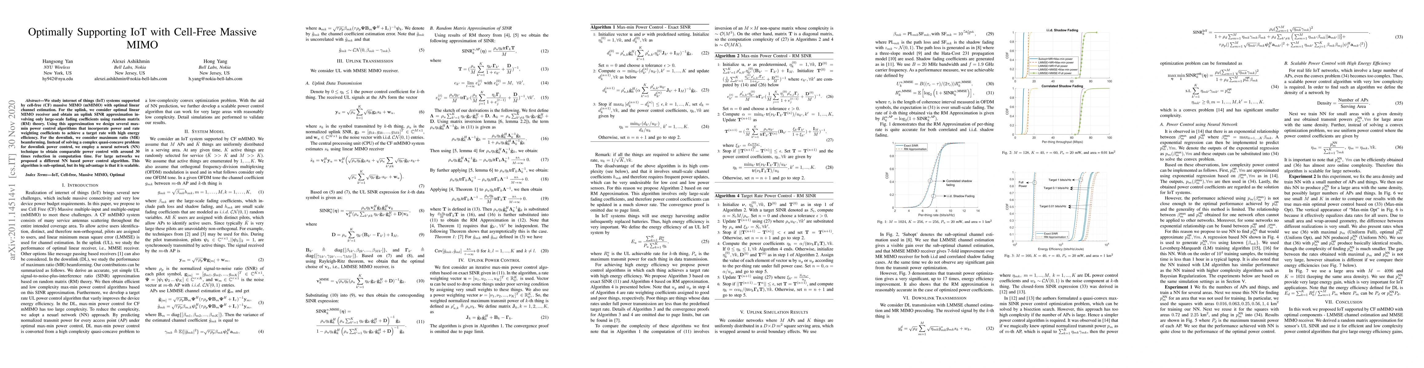 We study internet of things (IoT) systems supported by cell-free (CF) massive MIMO (mMIMO) with optimal linear channel estimation. For the uplink, we consider optimal linear MIMO receiver and obtain an uplink SINR approximation involving only large-scale fading coefficients using random matrix (RM) theory. Using this approximation we design several max-min power control algorithms that incorporate power and rate weighting coefficients to achieve a target rate with high energy efficiency. For the downlink, we consider maximum ratio (MR) beamforming. Instead of solving a complex quasi-concave problem for downlink power control, we employ a neural network (NN) technique to obtain comparable power control with around 30 times reduction in computation time. For large networks we proposed a different NN based power control algorithm. This algorithm is sub-optimal, but its big advantage is that it is scalable.