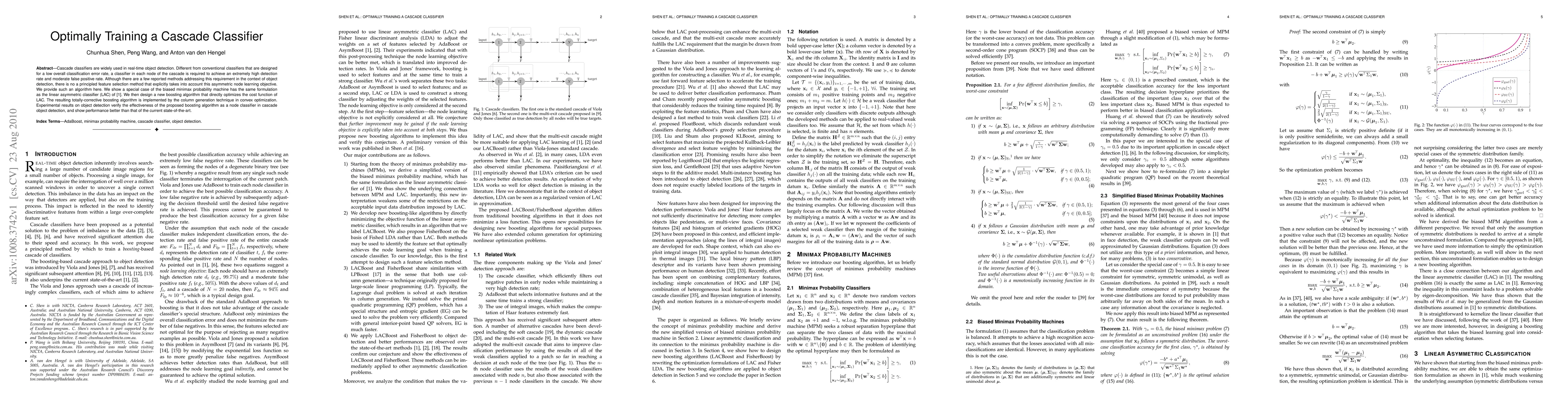 Cascade classifiers are widely used in real-time object detection. Different from conventional classifiers that are designed for a low overall classification error rate, a classifier in each node of the cascade is required to achieve an extremely high detection rate and moderate false positive rate. Although there are a few reported methods addressing this requirement in the context of object detection, there is no a principled feature selection method that explicitly takes into account this asymmetric node learning objective. We provide such an algorithm here. We show a special case of the biased minimax probability machine has the same formulation as the linear asymmetric classifier (LAC) of \cite{wu2005linear}. We then design a new boosting algorithm that directly optimizes the cost function of LAC. The resulting totally-corrective boosting algorithm is implemented by the column generation technique in convex optimization. Experimental results on object detection verify the effectiveness of the proposed boosting algorithm as a node classifier in cascade object detection, and show performance better than that of the current state-of-the-art.