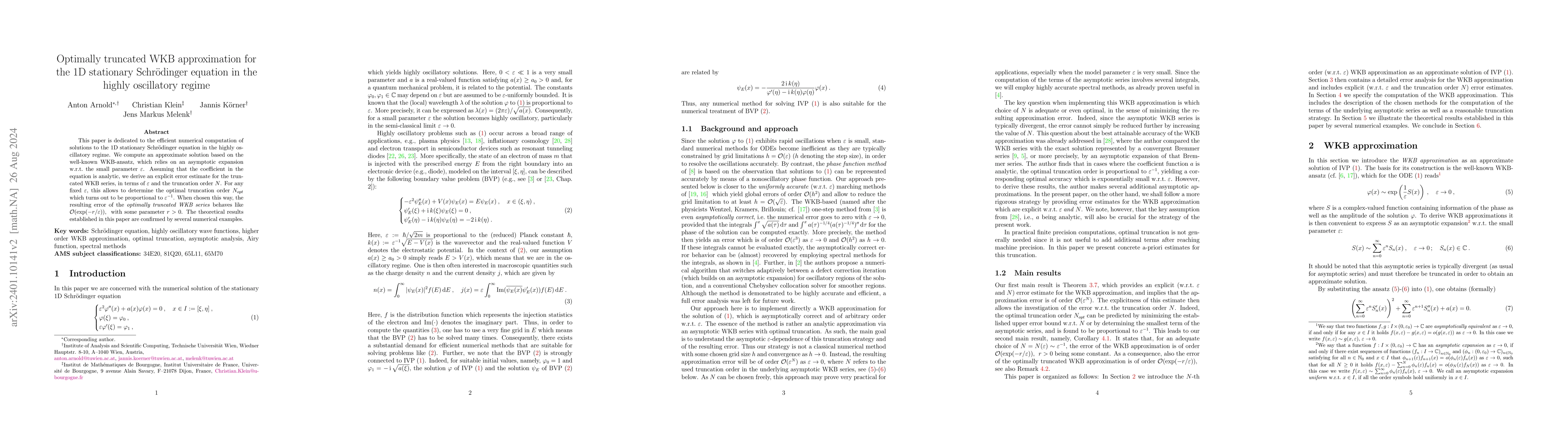This paper is dedicated to the efficient numerical computation of solutions to the 1D stationary Schr\"odinger equation in the highly oscillatory regime. We compute an approximate solution based on the well-known WKB-ansatz, which relies on an asymptotic expansion w.r.t. the small parameter $\varepsilon$. Assuming that the coefficient in the equation is analytic, we derive an explicit error estimate for the truncated WKB series, in terms of $\varepsilon$ and the truncation order $N$. For any fixed $\varepsilon$, this allows to determine the optimal truncation order $N_{opt}$ which turns out to be proportional to $\varepsilon^{-1}$. When chosen this way, the resulting error of the optimally truncated WKB series behaves like $\mathcal{O}(\varepsilon^{-2}\exp(-r/\varepsilon))$, with some parameter $r>0$. The theoretical results established in this paper are confirmed by several numerical examples.