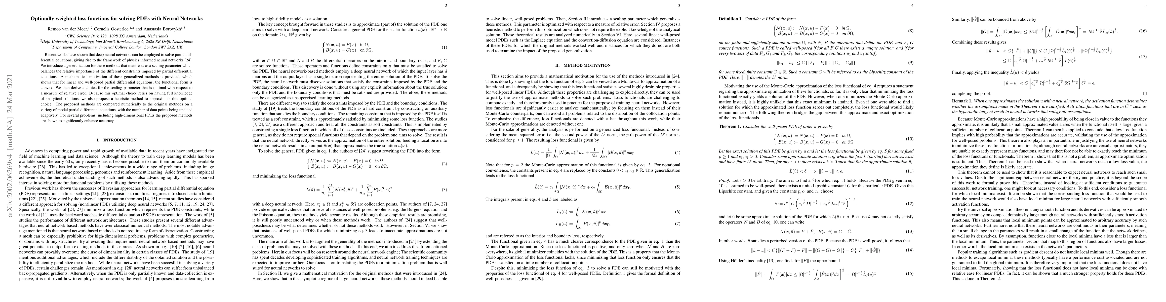 Recent works have shown that deep neural networks can be employed to solve partial differential equations, giving rise to the framework of physics informed neural networks. We introduce a generalization for these methods that manifests as a scaling parameter which balances the relative importance of the different constraints imposed by partial differential equations. A mathematical motivation of these generalized methods is provided, which shows that for linear and well-posed partial differential equations, the functional form is convex. We then derive a choice for the scaling parameter that is optimal with respect to a measure of relative error. Because this optimal choice relies on having full knowledge of analytical solutions, we also propose a heuristic method to approximate this optimal choice. The proposed methods are compared numerically to the original methods on a variety of model partial differential equations, with the number of data points being updated adaptively. For several problems, including high-dimensional PDEs the proposed methods are shown to significantly enhance accuracy.