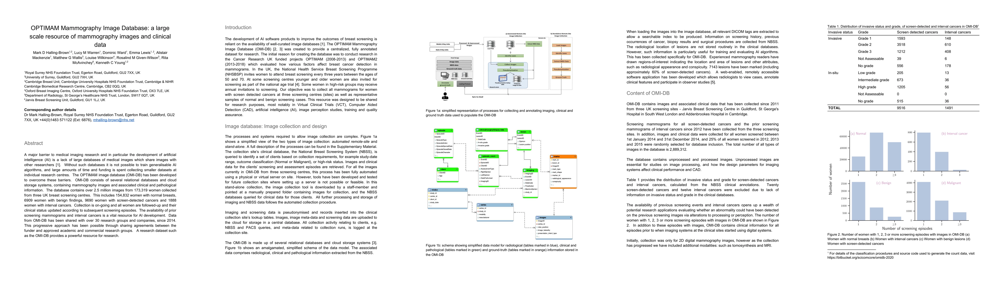 A major barrier to medical imaging research and in particular the development of artificial intelligence (AI) is a lack of large databases of medical images which share images with other researchers. Without such databases it is not possible to train generalisable AI algorithms, and large amounts of time and funding is spent collecting smaller datasets at individual research centres. The OPTIMAM image database (OMI-DB) has been developed to overcome these barriers. OMI-DB consists of several relational databases and cloud storage systems, containing mammography images and associated clinical and pathological information. The database contains over 2.5 million images from 173,319 women collected from three UK breast screening centres. This includes 154,832 women with normal breasts, 6909 women with benign findings, 9690 women with screen-detected cancers and 1888 women with interval cancers. Collection is on-going and all women are followed-up and their clinical status updated according to subsequent screening episodes. The availability of prior screening mammograms and interval cancers is a vital resource for AI development. Data from OMI-DB has been shared with over 30 research groups and companies, since 2014. This progressive approach has been possible through sharing agreements between the funder and approved academic and commercial research groups. A research dataset such as the OMI-DB provides a powerful resource for research.