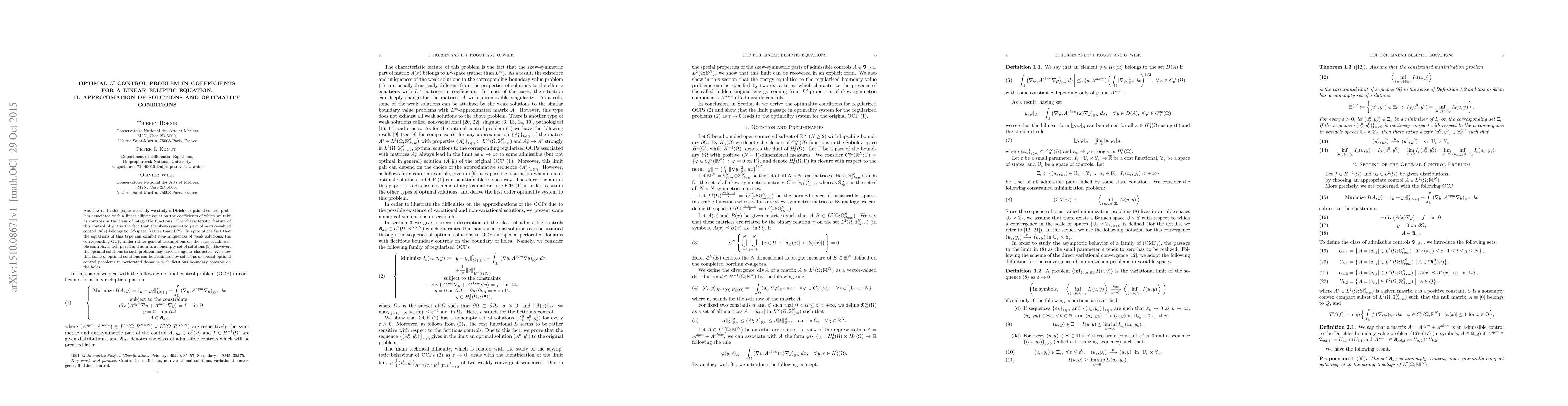 In this paper we study we study a Dirichlet optimal control prob- lem associated with a linear elliptic equation the coefficients of which we take as controls in the class of integrable functions. The characteristic feature of this control object is the fact that the skew-symmetric part of matrix-valued control A(x) belongs to L2-space (rather than Linfinty). In spite of the fact that the equations of this type can exhibit non-uniqueness of weak solutions, the corresponding OCP, under rather general assumptions on the class of admissi- ble controls, is well-posed and admits a nonempty set of solutions [9]. However, the optimal solutions to such problem may have a singular character. We show that some of optimal solutions can be attainable by solutions of special optimal control problems in perforated domains with fictitious boundary controls on the holes.
