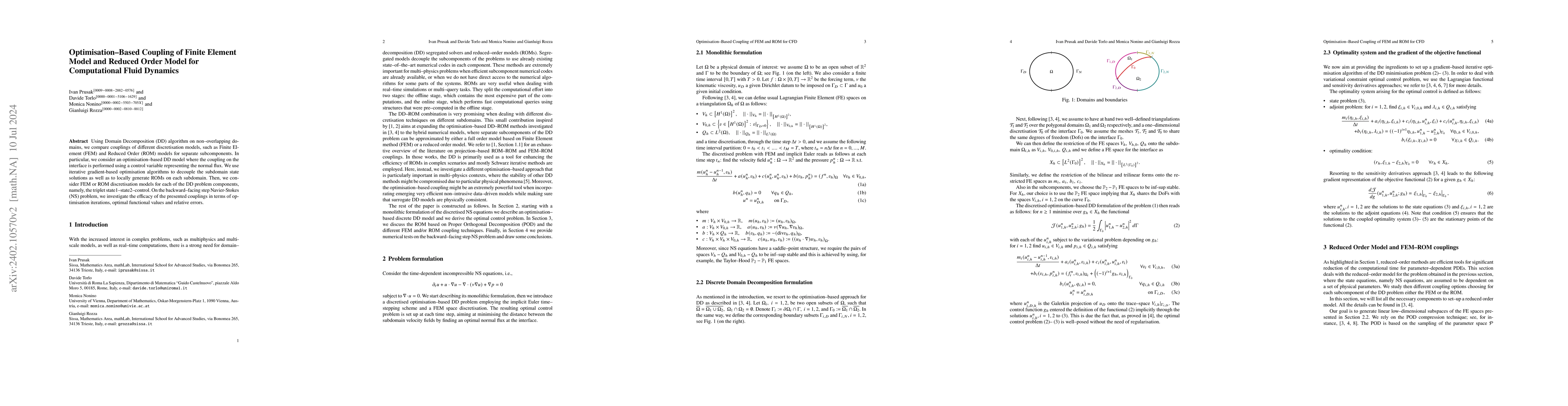 This paper proposes an optimisation-based coupling method for Finite Element Models (FEM) and Reduced Order Models (ROM) in computational fluid dynamics, using domain-decomposition to decouple subcomponents. The method employs gradient-based optimisation to iteratively solve the coupled subdomains and generate ROMs, validated through numerical tests on the backward-facing step Navier-Stokes problem.