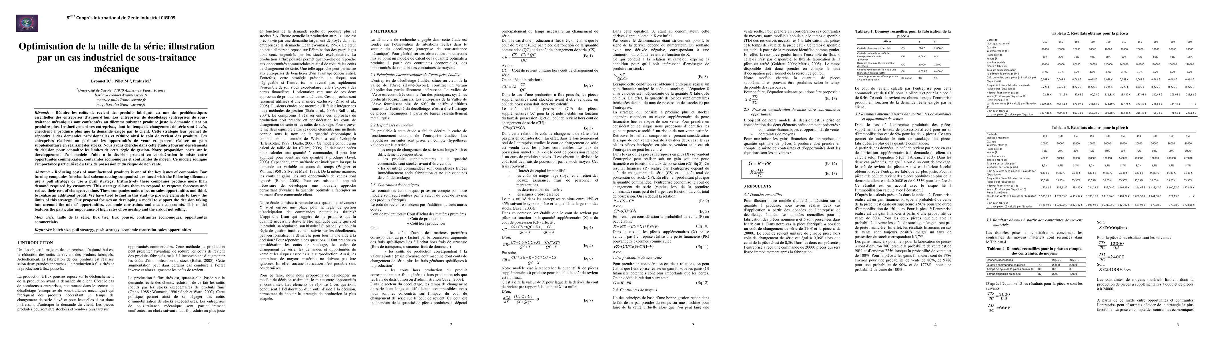 Reducing costs of manufactured products is one of the key issues of companies. Bar turning companies (mechanical subcontracting companies) are faced with the following dilemma: use a pull strategy or use a push strategy. Instinctively these companies produce more than demand required by customers. This strategy allows them to respond to requests forecasts and reduce their cost of changeover time. These companies make a bet on sales opportunities and think to realize an additional profit. We have tried to find in this study to provide elements to know the limits of this strategy. Our proposal focuses on developing a model to support the decision taking into account the mix of opportunities, economic constraints and mean constraints. This model features the particular importance of high rates of ownership and the risk of not selling. R\'eduire les co\^uts de revient des produits fabriqu\'es est une des probl\'ematiques essentielles des entreprises d'aujourd'hui. Les entreprises de d\'ecolletage (entreprises de sous-traitance m\'ecanique) sont confront\'ees au dilemme suivant : produire juste la demande client ou produire plus. Instinctivement ces entreprises, dont les temps de changement de s\'erie sont \'elev\'es, cherchent \`a produire plus que la demande exig\'ee par le client. Cette strat\'egie leur permet de r\'epondre \`a des demandes pr\'evisionnelles et r\'eduire ainsi le co\^ut de revient des produits. Ces entreprises r\'ealisent un pari sur les opportunit\'es de vente et pensent r\'ealiser un gain suppl\'ementaire en r\'ealisant des stocks. Nous avons cherch\'e dans cette \'etude \`a fournir des \'el\'ements de d\'ecision pour conna\^itre les limites de cette r\`egle de gestion. Notre proposition porte sur le d\'eveloppement d'un mod\`ele d'aide \`a la d\'ecision prenant en consid\'eration le mixte entre opportunit\'es commerciales, contraintes \'economiques et contraintes de moyen. Ce mod\`ele souligne l'importance particuli\`ere du taux de possession et du risque de non vente.