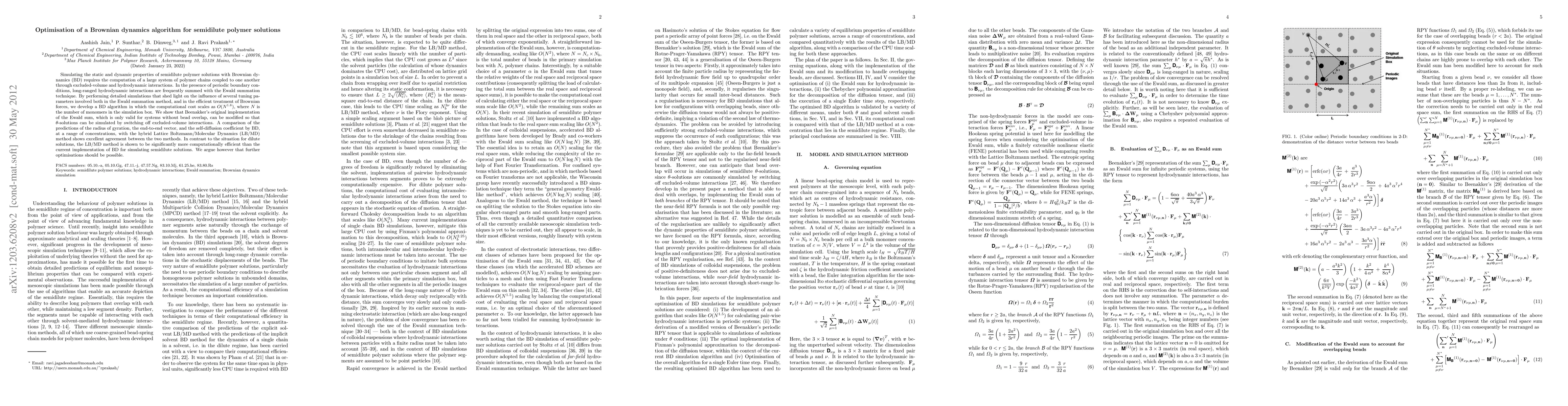 This paper optimizes a Brownian dynamics algorithm for simulating semidilute polymer solutions, achieving a computational cost of O(N^{1.8}). The authors modify Beenakker's Ewald summation technique to handle bead overlaps and demonstrate excellent agreement between their optimized BD method and the hybrid LB/MD method for various properties.