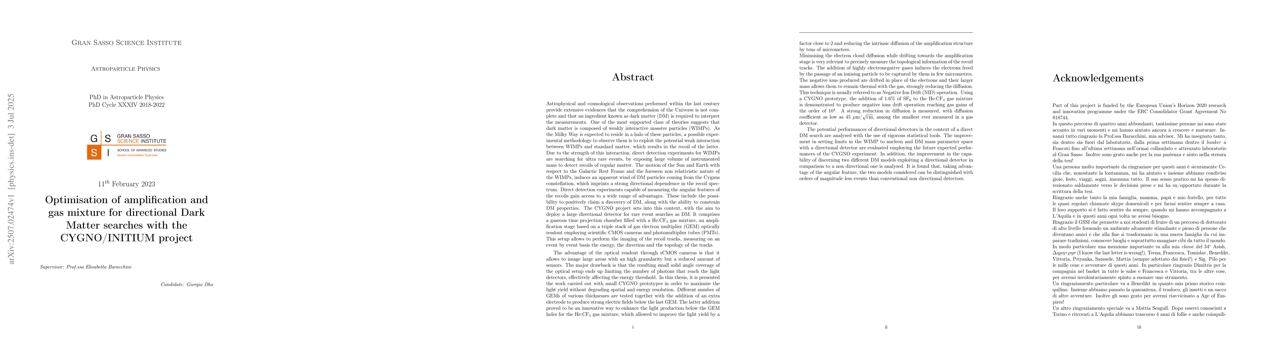 Astrophysical and cosmological observations suggest the existence of beyond standard model ingredient known as dark matter (DM). One of the most supported class of theories suggests that DM is composed of weakly interactive massive particles (WIMPs), possibly detectable via weak interaction with standard matter resulting in the recoil of the latter. The motion of the Sun and Earth with respect to the Galactic Centre is expected to induce a strong directional dependence in the recoil spectrum. Direct detection experiments capable of measuring the angular features of the recoils gain access to a wide range of advantages such as the possibility to positively claim a discovery of DM. The CYGNO project sets into this context, with the aim of deploying a large directional detector for rare event searches as DM. It exploits a gaseous time projection chamber filled with a He:CF4 gas mixture with a segmented amplification stage and granular optical readout. In this thesis, it is presented the work carried out with small CYGNO prototypes to maximise the light yield without degrading spatial and energy resolution, the addition of highly electronegative gases to induce a reduction of the electron cloud diffusion while drifting towards the amplification stage, very relevant to precisely measure the topological information of the recoil tracks. Moreover, the potential performances of directional detectors in the context of a direct DM search are analysed with the use of rigorous statistical tools both in the improvement in setting limits in the WIMP to nucleon sensitivity and in the capability of discerning two different DM models exploiting a directional detector.