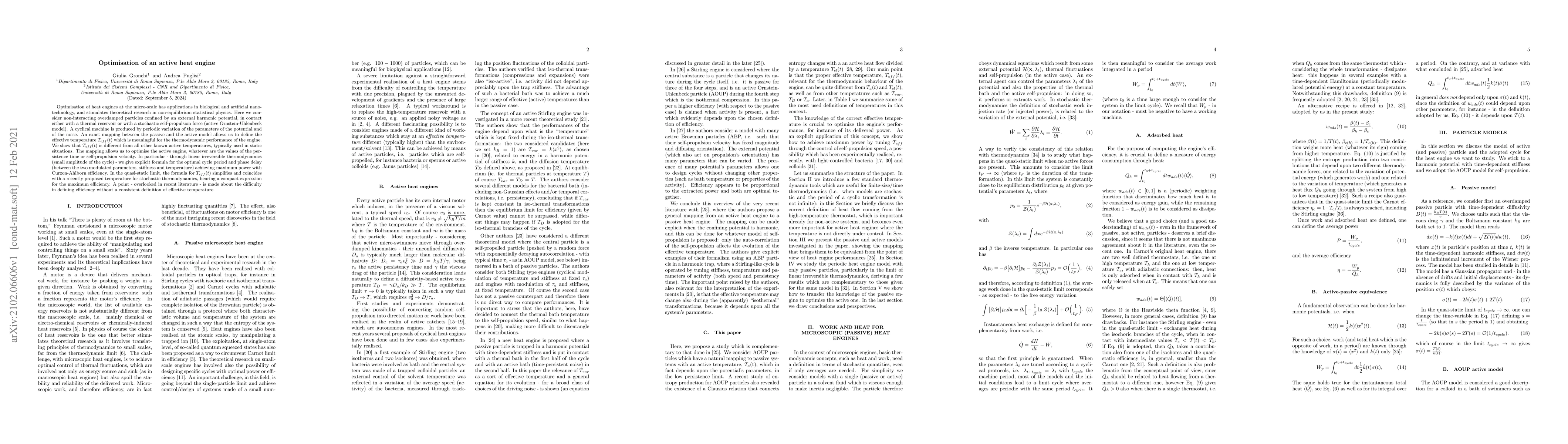 Optimisation of heat engines at the micro-scale has applications in biological and artificial nano-technology, and stimulates theoretical research in non-equilibrium statistical physics. Here we consider non-interacting overdamped particles confined by an external harmonic potential, in contact either with a thermal reservoir or with a stochastic self-propulsion force (active Ornstein-Uhlenbeck model). A cyclical machine is produced by periodic variation of the parameters of the potential and of the noise. An exact mapping between the passive and the active model allows us to define the effective temperature $T_{eff}(t)$ which is meaningful for the thermodynamic performance of the engine. We show that $T_{eff}(t)$ is different from all other known active temperatures, typically used in static situations. The mapping allows us to optimise the active engine, whatever are the values of the persistence time or self-propulsion velocity. In particular - through linear irreversible thermodynamics (small amplitude of the cycle) - we give explicit formula for the optimal cycle period and phase delay (between the two modulated parameters, stiffness and temperature) achieving maximum power with Curzon-Ahlborn efficiency. In the quasi-static limit, the formula for $T_{eff}(t)$ simplifies and coincides with a recently proposed temperature for stochastic thermodynamics, bearing a compact expression for the maximum efficiency. A point - overlooked in recent literature - is made about the difficulty in defining efficiency without a consistent definition of effective temperature.