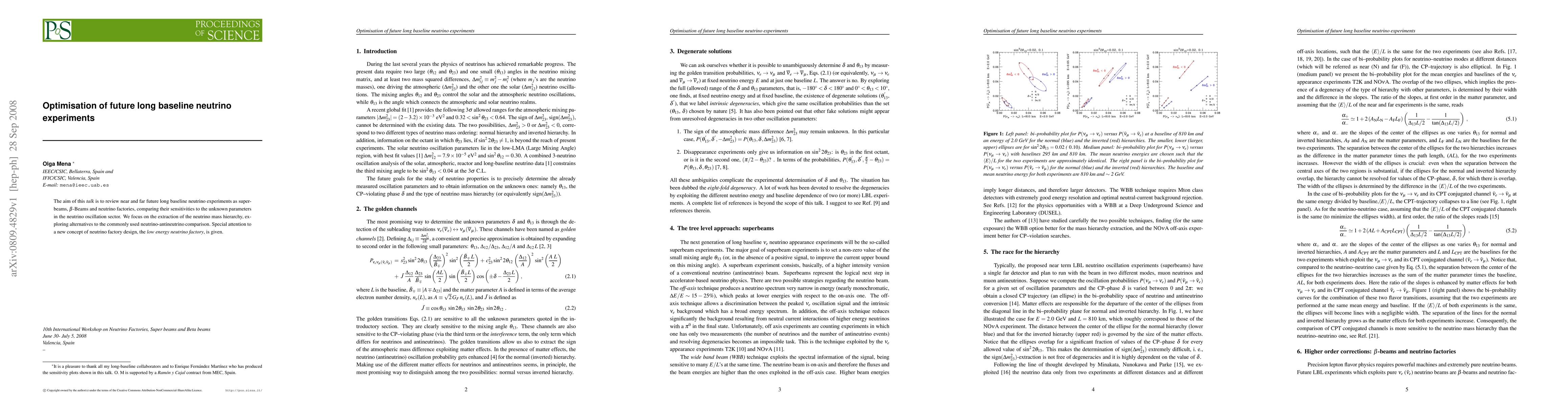 This paper reviews upcoming long baseline neutrino experiments, including superbeams, beta-Beams, and neutrino factories, to compare their sensitivities to neutrino oscillation parameters. It highlights the potential of a low energy neutrino factory design for determining the neutrino mass hierarchy.