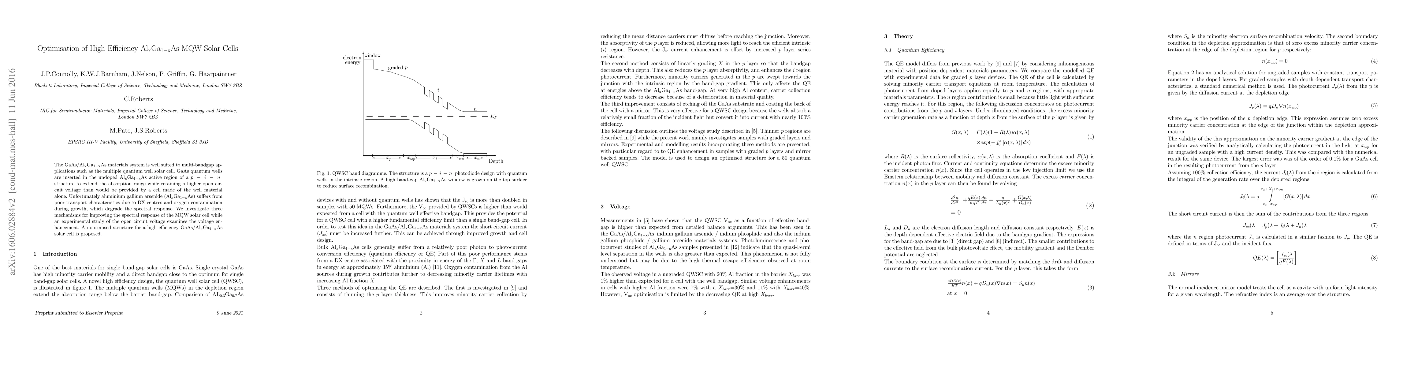 This paper investigates the optimisation of high efficiency GaAs/AlGaAs multi-quantum well (MQW) solar cells by enhancing spectral response and open circuit voltage. An optimised structure is proposed to address transport issues caused by DX centres and oxygen contamination.