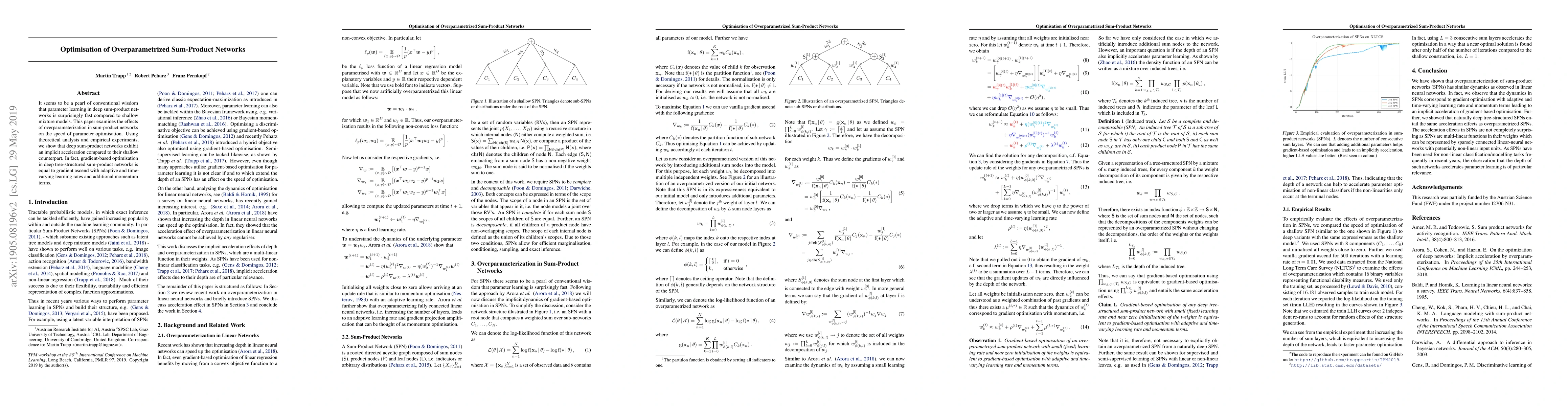 It seems to be a pearl of conventional wisdom that parameter learning in deep sum-product networks is surprisingly fast compared to shallow mixture models. This paper examines the effects of overparameterization in sum-product networks on the speed of parameter optimisation. Using theoretical analysis and empirical experiments, we show that deep sum-product networks exhibit an implicit acceleration compared to their shallow counterpart. In fact, gradient-based optimisation in deep tree-structured sum-product networks is equal to gradient ascend with adaptive and time-varying learning rates and additional momentum terms.