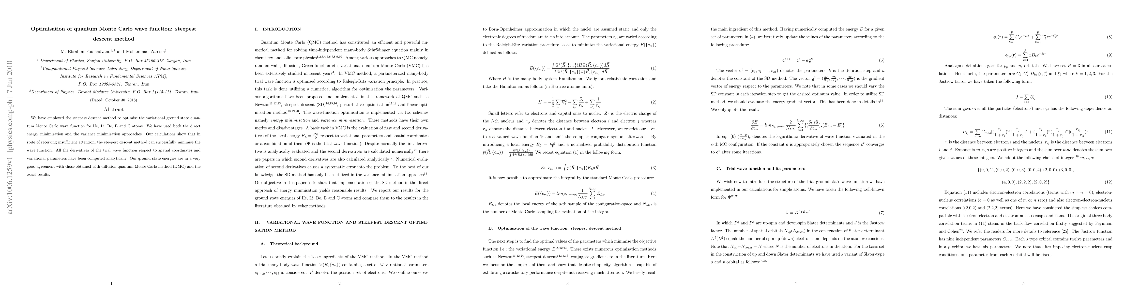 This paper optimises the variational ground state quantum Monte Carlo wave function for He, Li, Be, B, and C atoms using the steepest descent method, showing its effectiveness through both direct energy and variance minimisation. The method's success is demonstrated by its agreement with diffusion quantum Monte Carlo and exact results.