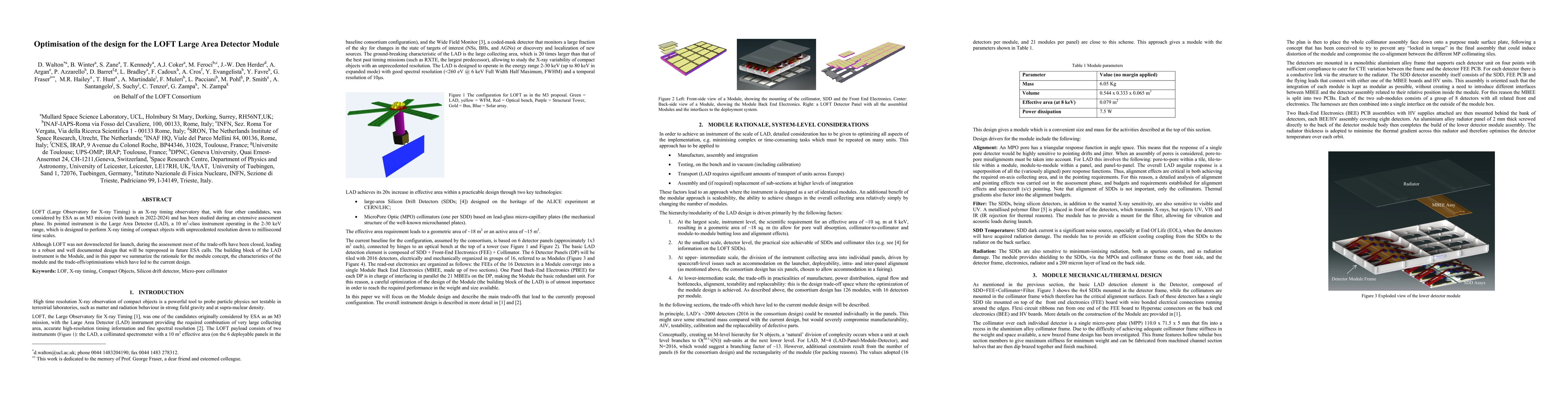 This paper details the optimisation of the design for the LOFT Large Area Detector Module, focusing on the module concept, the characteristics of the module, and the trade-offs/optimisations that led to the current robust and well-documented design for future ESA mission proposals.