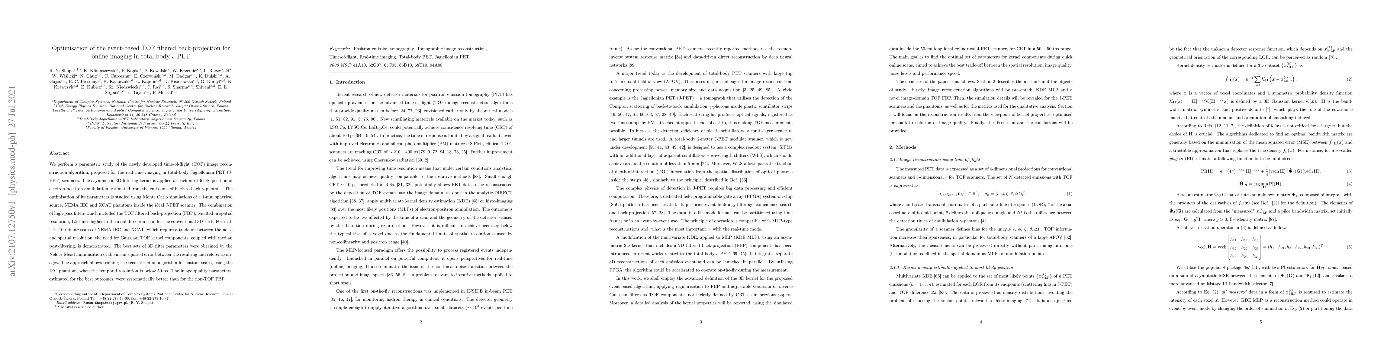 This paper optimizes a new TOF-based filtered back-projection algorithm for real-time imaging in J-PET scanners, achieving 1.5x higher axial resolution. The study uses Monte Carlo simulations and phantoms to determine optimal filter parameters, demonstrating improved image quality over conventional methods.