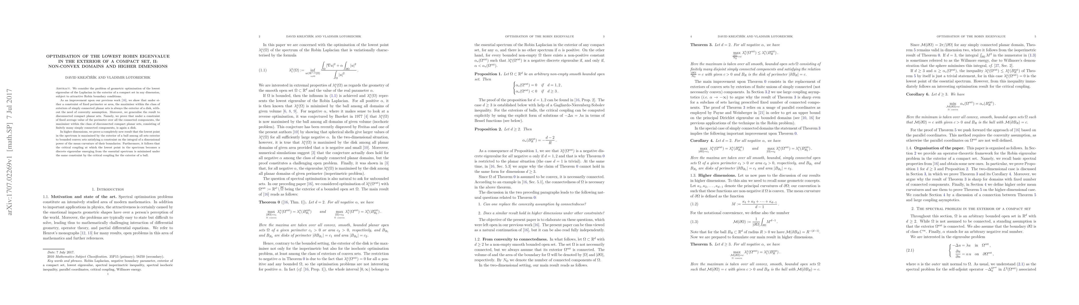 This paper optimises the lowest Robin eigenvalue of the Laplacian in the exterior of compact sets, proving that the maximiser is the exterior of a disk in non-convex domains, without requiring convexity. It extends the result to higher dimensions, showing that the exterior of a ball optimises the lowest eigenvalue under specific constraints.