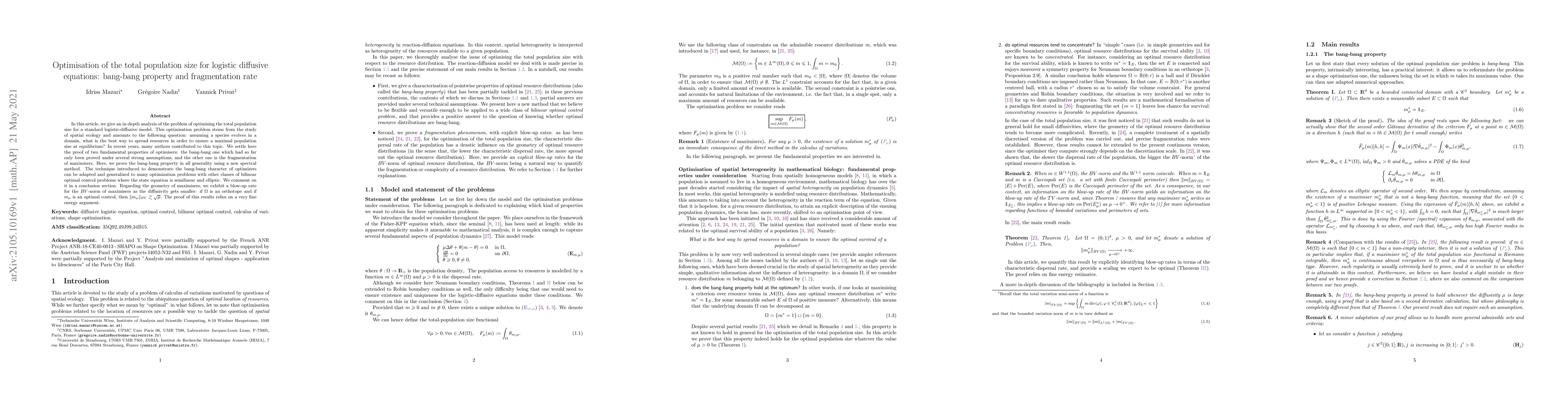 In this article, we give an in-depth analysis of the problem of optimising the total population size for a standard logistic-diffusive model. This optimisation problem stems from the study of spatial ecology and amounts to the following question: assuming a species evolves in a domain, what is the best way to spread resources in order to ensure a maximal population size at equilibrium? {In recent years, many authors contributed to this topic.} We settle here the proof of two fundamental properties of optimisers: the bang-bang one which had so far only been proved under several strong assumptions, and the other one is the fragmentation of maximisers. Here, we prove the bang-bang property in all generality using a new spectral method. The technique introduced to demonstrate the bang-bang character of optimizers can be adapted and generalized to many optimization problems with other classes of bilinear optimal control problems where the state equation is semilinear and elliptic. We comment on it in a conclusion section.Regarding the geometry of maximisers, we exhibit a blow-up rate for the $BV$-norm of maximisers as the diffusivity gets smaller: if $\O$ is an orthotope and if $m_\mu$ is an optimal control, then $\Vert m_\mu\Vert_{BV}\gtrsim \sqrt{\mu}$. The proof of this results relies on a very fine energy argument.