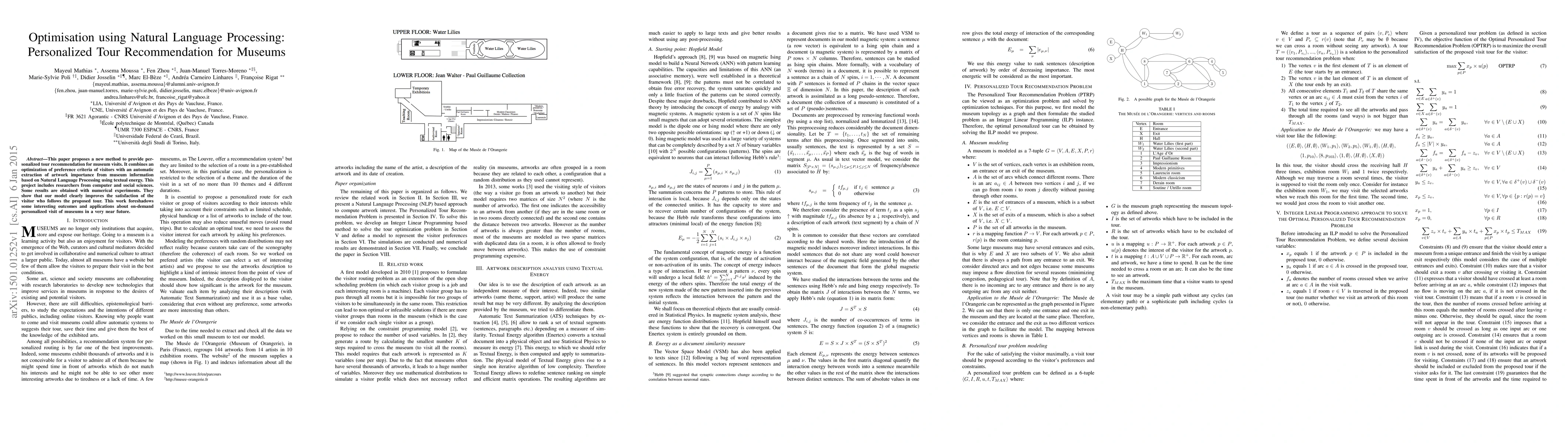 This paper proposes a new method to provide personalized tour recommendation for museum visits. It combines an optimization of preference criteria of visitors with an automatic extraction of artwork importance from museum information based on Natural Language Processing using textual energy. This project includes researchers from computer and social sciences. Some results are obtained with numerical experiments. They show that our model clearly improves the satisfaction of the visitor who follows the proposed tour. This work foreshadows some interesting outcomes and applications about on-demand personalized visit of museums in a very near future.
