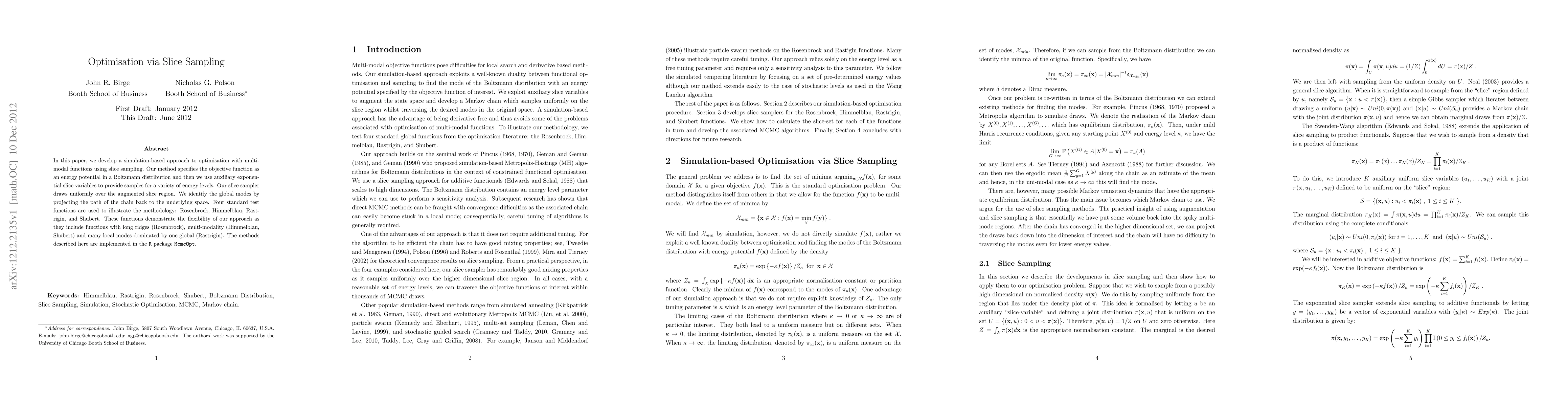 In this paper, we develop a simulation-based approach to optimisation with multi-modal functions using slice sampling. Our method specifies the objective function as an energy potential in a Boltzmann distribution and then we use auxiliary exponential slice variables to provide samples for a variety of energy levels. Our slice sampler draws uniformly over the augmented slice region. We identify the global modes by projecting the path of the chain back to the underlying space. Four standard test functions are used to illustrate the methodology: Rosenbrock, Himmelblau, Rastrigin, and Shubert. These functions demonstrate the flexibility of our approach as they include functions with long ridges (Rosenbrock), multi-modality (Himmelblau, Shubert) and many local modes dominated by one global (Rastrigin). The methods described here are implemented in the {\tt R} package {\tt McmcOpt}.