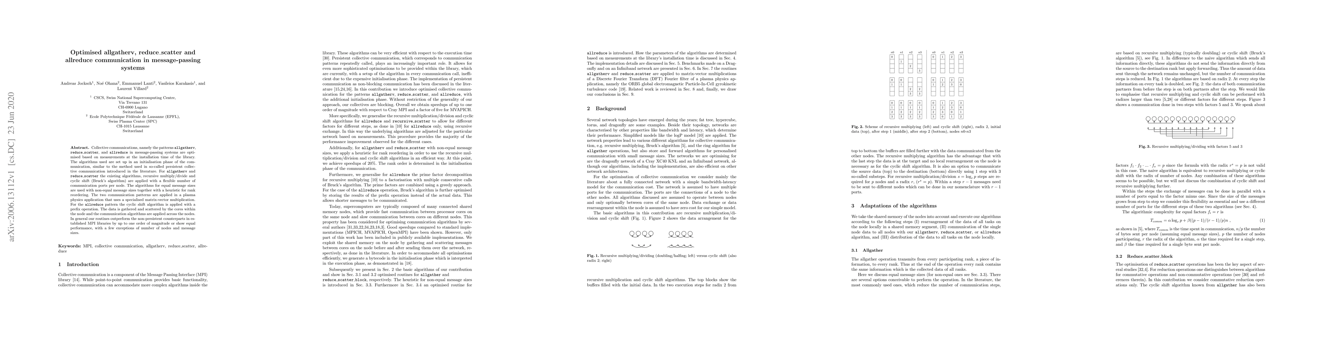 Researchers optimized three collective communication patterns in message-passing systems, outperforming traditional libraries by up to an order of magnitude, with the best results seen in plasma physics applications.