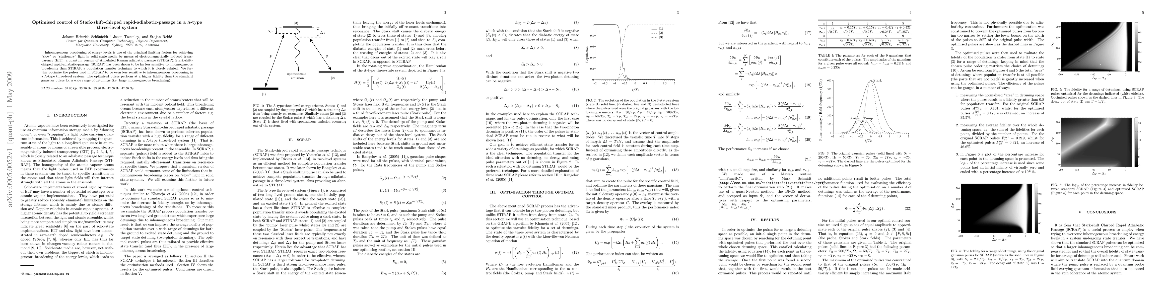 Inhomogeneous broadening of energy levels is one of the principal limiting factors for achieving "slow" or "stationary" light in solid state media by means of electromagnetically induced transparency (EIT), a quantum version of stimulated Raman adiabatic passage (STIRAP). Stark-shift-chirped rapid-adiabatic-passage (SCRAP) has been shown to be far less sensitive to inhomogeneous broadening than STIRAP, a population transfer technique to which it is closely related. We further optimise the pulses used in SCRAP to be even less sensitive to inhomogeneous broadening in a lambda-type three-level system. The optimised pulses perform at a higher fidelity than the standard gaussian pulses for a wide range of detunings (i.e. large inhomogeneous broadening).
