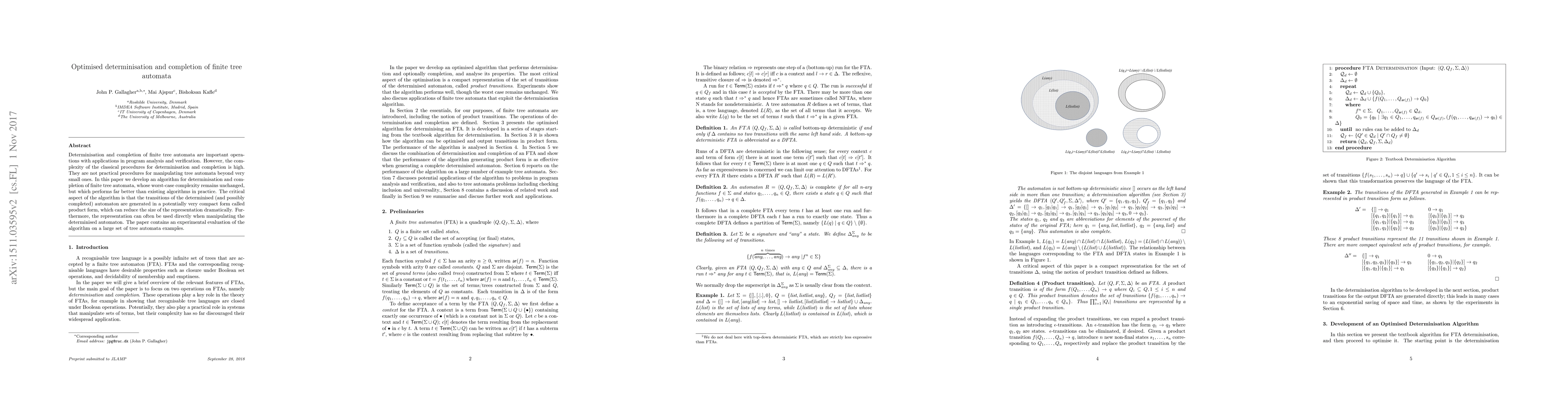 This paper presents an improved algorithm for determinisation and completion of finite tree automata, maintaining theoretical complexity while significantly outperforming existing methods in practice due to compact "product form" transition representations. Experimental results show substantial reductions in representation size and enhanced practicality for larger automata.