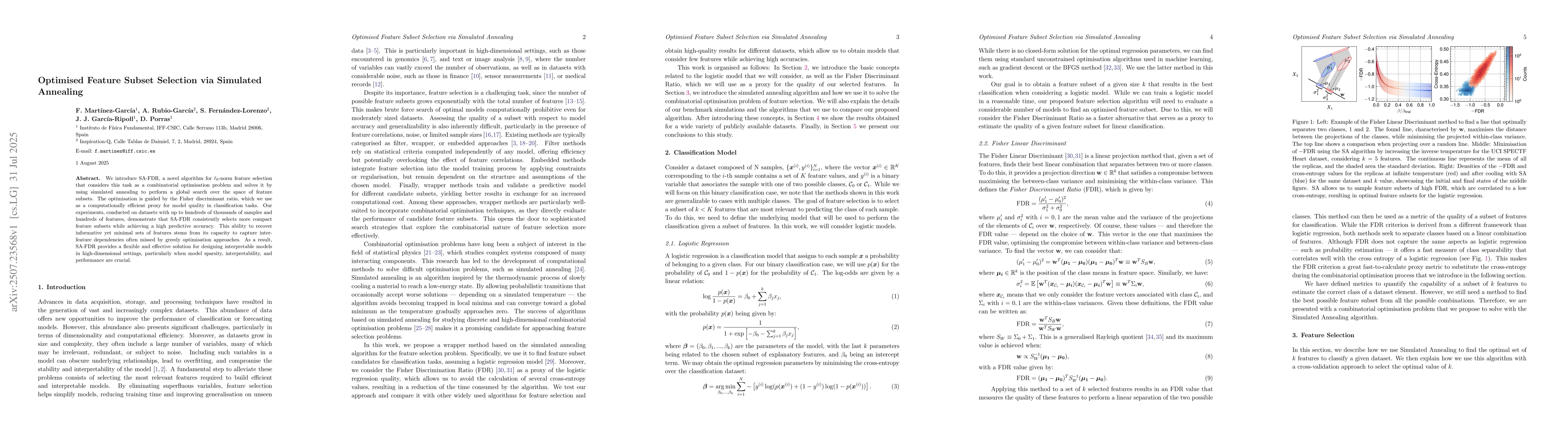 We introduce SA-FDR, a novel algorithm for $\ell_0$-norm feature selection that considers this task as a combinatorial optimisation problem and solves it by using simulated annealing to perform a global search over the space of feature subsets. The optimisation is guided by the Fisher discriminant ratio, which we use as a computationally efficient proxy for model quality in classification tasks. Our experiments, conducted on datasets with up to hundreds of thousands of samples and hundreds of features, demonstrate that SA-FDR consistently selects more compact feature subsets while achieving a high predictive accuracy. This ability to recover informative yet minimal sets of features stems from its capacity to capture inter-feature dependencies often missed by greedy optimisation approaches. As a result, SA-FDR provides a flexible and effective solution for designing interpretable models in high-dimensional settings, particularly when model sparsity, interpretability, and performance are crucial.