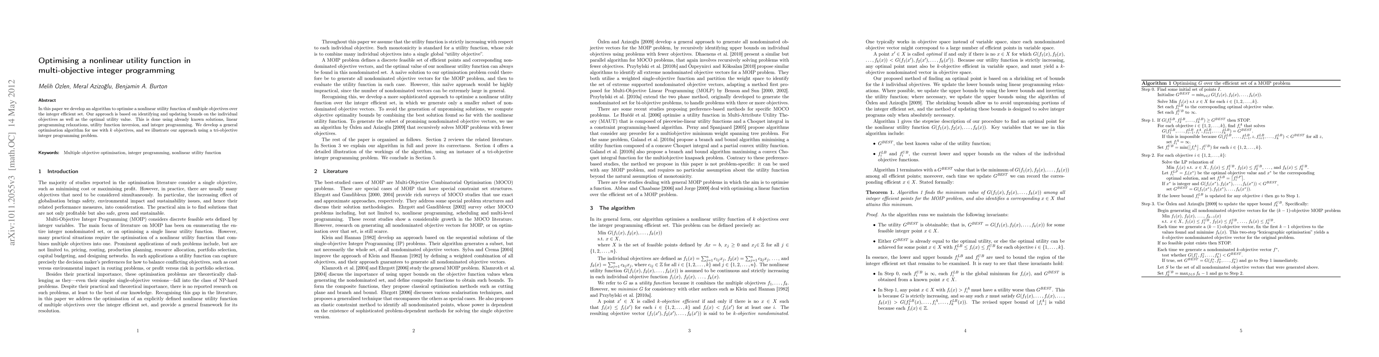 In this paper we develop an algorithm to optimise a nonlinear utility function of multiple objectives over the integer efficient set. Our approach is based on identifying and updating bounds on the individual objectives as well as the optimal utility value. This is done using already known solutions, linear programming relaxations, utility function inversion, and integer programming. We develop a general optimisation algorithm for use with k objectives, and we illustrate our approach using a tri-objective integer programming problem.