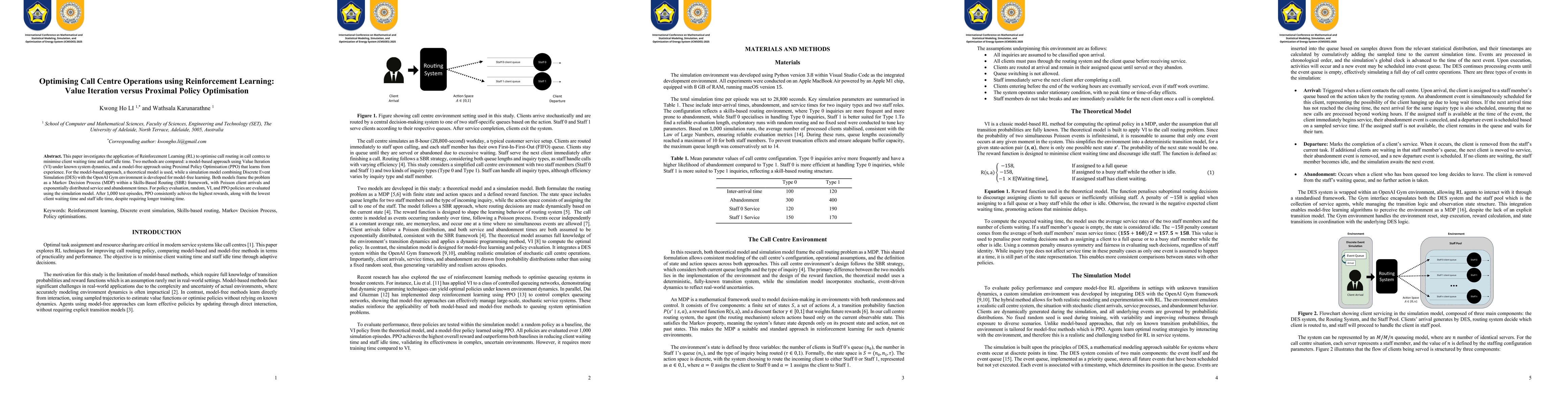This paper investigates the application of Reinforcement Learning (RL) to optimise call routing in call centres to minimise client waiting time and staff idle time. Two methods are compared: a model-based approach using Value Iteration (VI) under known system dynamics, and a model-free approach using Proximal Policy Optimisation (PPO) that learns from experience. For the model-based approach, a theoretical model is used, while a simulation model combining Discrete Event Simulation (DES) with the OpenAI Gym environment is developed for model-free learning. Both models frame the problem as a Markov Decision Process (MDP) within a Skills-Based Routing (SBR) framework, with Poisson client arrivals and exponentially distributed service and abandonment times. For policy evaluation, random, VI, and PPO policies are evaluated using the simulation model. After 1,000 test episodes, PPO consistently achives the highest rewards, along with the lowest client waiting time and staff idle time, despite requiring longer training time.