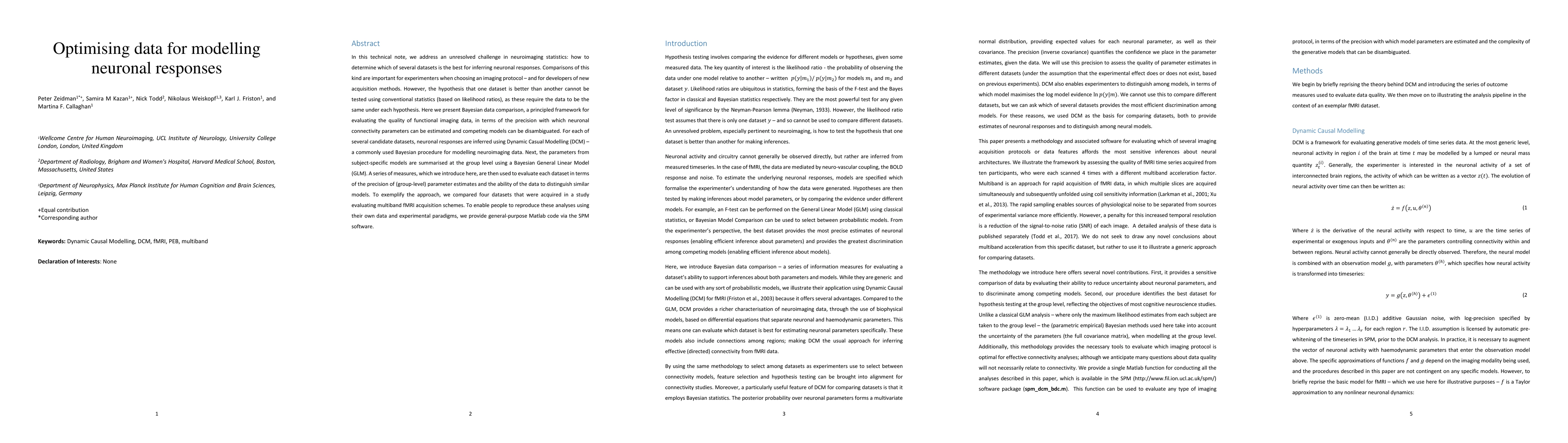 In this technical note, we address an unresolved challenge in neuroimaging statistics: how to determine which of several datasets is the best for inferring neuronal responses. Comparisons of this kind are important for experimenters when choosing an imaging protocol - and for developers of new acquisition methods. However, the hypothesis that one dataset is better than another cannot be tested using conventional statistics (based on likelihood ratios), as these require the data to be the same under each hypothesis. Here we present Bayesian data comparison, a principled framework for evaluating the quality of functional imaging data, in terms of the precision with which neuronal connectivity parameters can be estimated and competing models can be disambiguated. For each of several candidate datasets, neuronal responses are inferred using Dynamic Casual Modelling (DCM) - a commonly used Bayesian procedure for modelling neuroimaging data. Next, the parameters from subject-specific models are summarised at the group level using a Bayesian General Linear Model (GLM). A series of measures, which we introduce here, are then used to evaluate each dataset in terms of the precision of (group-level) parameter estimates and the ability of the data to distinguish similar models. To exemplify the approach, we compared four datasets that were acquired in a study evaluating multiband fMRI acquisition schemes. To enable people to reproduce these analyses using their own data and experimental paradigms, we provide general-purpose Matlab code via the SPM software.