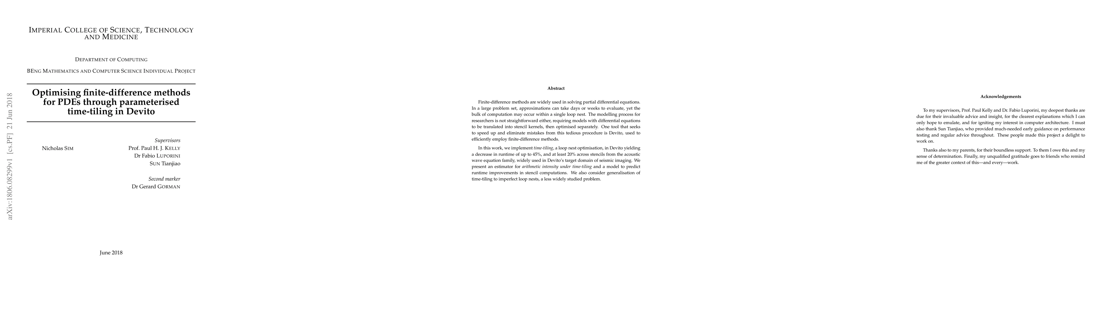 This paper optimises finite-difference methods for solving PDEs in Devito by implementing time-tiling, achieving up to 45% reduction in runtime for acoustic wave equation stencils. It also introduces an arithmetic intensity estimator and a runtime prediction model for stencil computations.