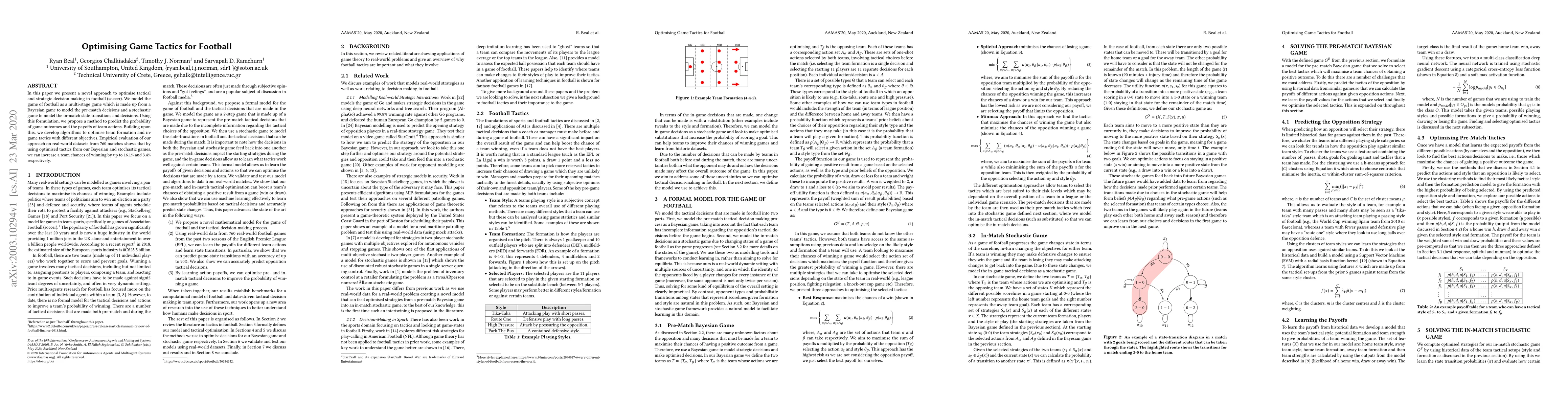 This research uses a Bayesian game theory approach to model football tactics and decision-making.