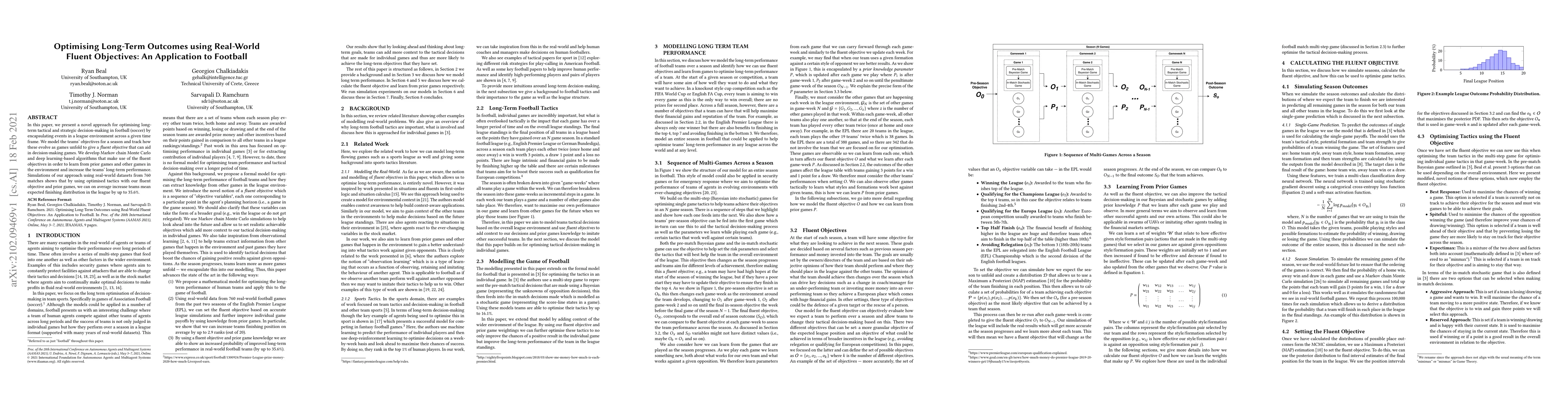 In this paper, we present a novel approach for optimising long-term tactical and strategic decision-making in football (soccer) by encapsulating events in a league environment across a given time frame. We model the teams' objectives for a season and track how these evolve as games unfold to give a fluent objective that can aid in decision-making games. We develop Markov chain Monte Carlo and deep learning-based algorithms that make use of the fluent objectives in order to learn from prior games and other games in the environment and increase the teams' long-term performance. Simulations of our approach using real-world datasets from 760 matches shows that by using optimised tactics with our fluent objective and prior games, we can on average increase teams mean expected finishing distribution in the league by up to 35.6%.