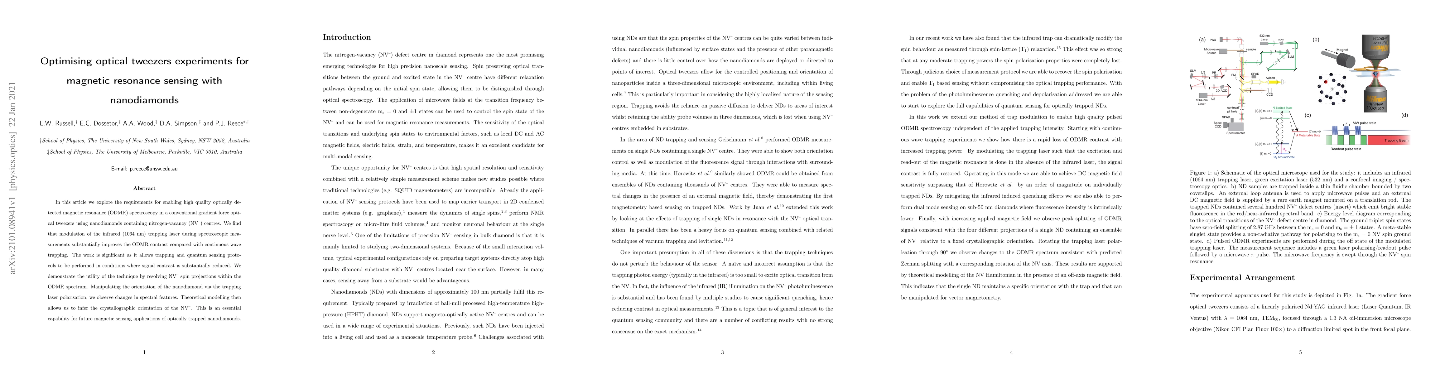 In this article we explore the requirements for enabling high quality optically detected magnetic resonance (ODMR) spectroscopy in a conventional gradient force optical tweezers using nanodiamonds containing nitrogen-vacancy (NV$^{-}$) centres. We find that modulation of the infrared (1064 nm) trapping laser during spectroscopic measurements substantially improves the ODMR contrast compared with continuous wave trapping. The work is significant as it allows trapping and quantum sensing protocols to be performed in conditions where signal contrast is substantially reduced. We demonstrate the utility of the technique by resolving NV$^{-}$ spin projections within the ODMR spectrum. Manipulating the orientation of the nanodiamond via the trapping laser polarisation, we observe changes in spectral features. Theoretical modelling then allows us to infer the crystallographic orientation of the NV$^{-}$. This is an essential capability for future magnetic sensing applications of optically trapped nanodiamonds.