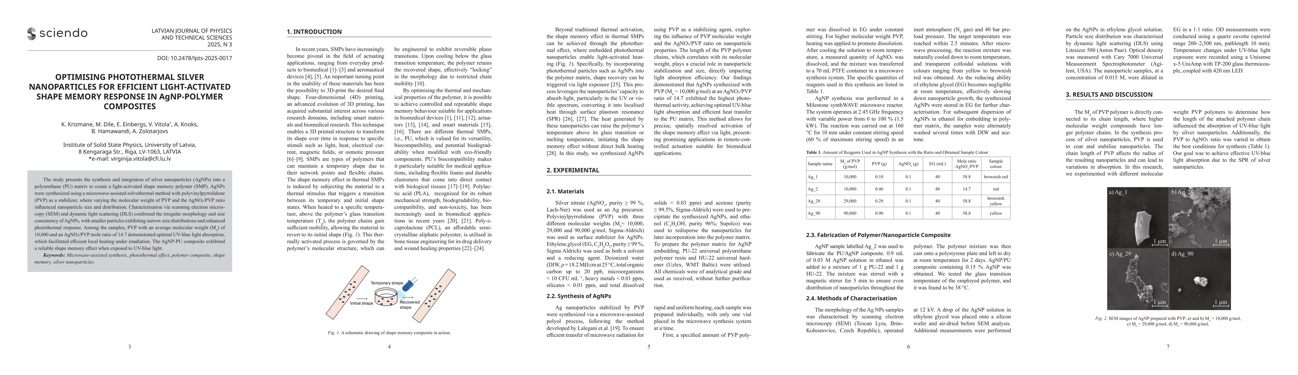 The study presents the synthesis and integration of silver nanoparticles (AgNPs) into a polyurethane (PU) matrix to create a light-activated shape memory polymer (SMP). AgNPs were synthesized using a microwave-assisted solvothermal method with polyvinylpyrrolidone (PVP) as a stabilizer, where varying the molecular weight of PVP and the AgNO3/PVP ratio influenced nanoparticle size and distribution. Characterisation via scanning electron microscopy (SEM) and dynamic light scattering (DLS) confirmed the irregular morphology and size consistency of AgNPs, with smaller particles exhibiting narrow size distributions and enhanced photothermal response. Among the samples, PVP with an average molecular weight (Mn) of 10,000 and an AgNO3/PVP mole ratio of 14.7 demonstrated optimal UV-blue light absorption, which facilitated efficient local heating under irradiation. The AgNP-PU composite exhibited a reliable shape memory effect when exposed to UV-blue light.