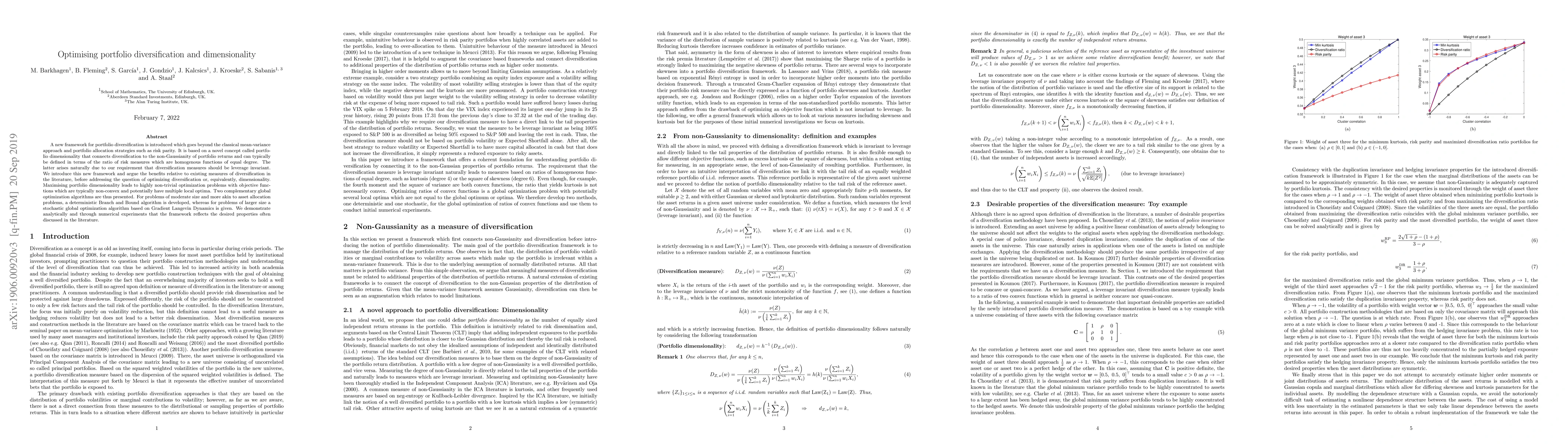 This paper introduces a new framework for portfolio diversification based on portfolio dimensionality, which connects diversification to the non-Gaussianity of returns. It proposes optimization algorithms to maximize portfolio dimensionality, addressing non-convex optimization challenges with deterministic and stochastic methods.