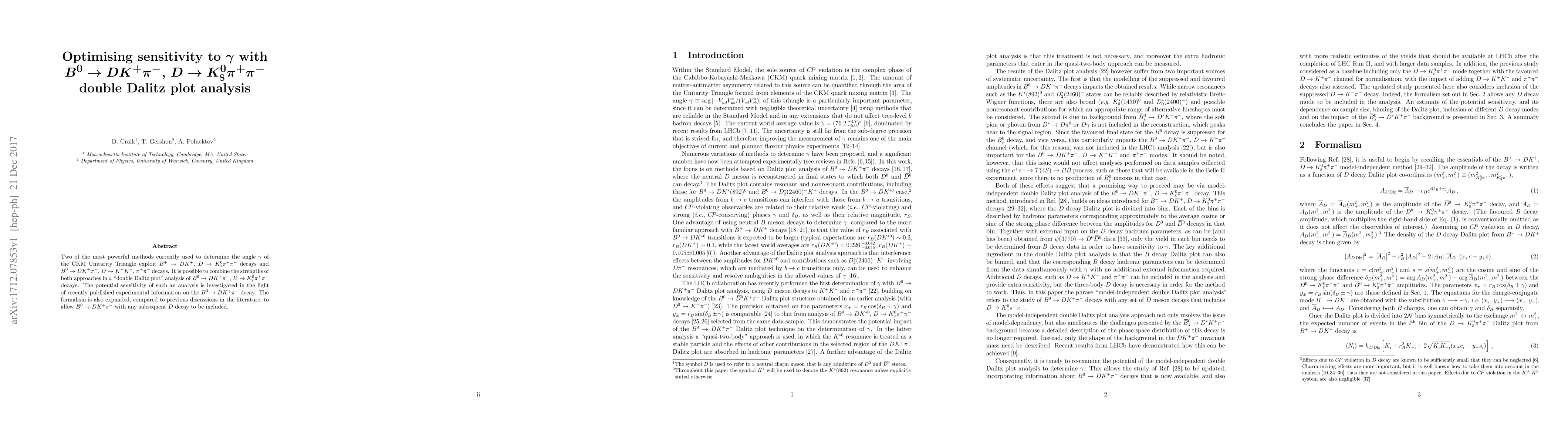 This paper explores optimizing sensitivity to the CKM matrix parameter $\gamma$ through a "double Dalitz plot" analysis of $B^0 \to DK^+\pi^-$ and $D \to K_{\rm S}^0\pi^+\pi^-$ decays, combining strengths from different decay channels to enhance experimental determination. The study also expands the formalism to include a broader range of $D$ decay possibilities.