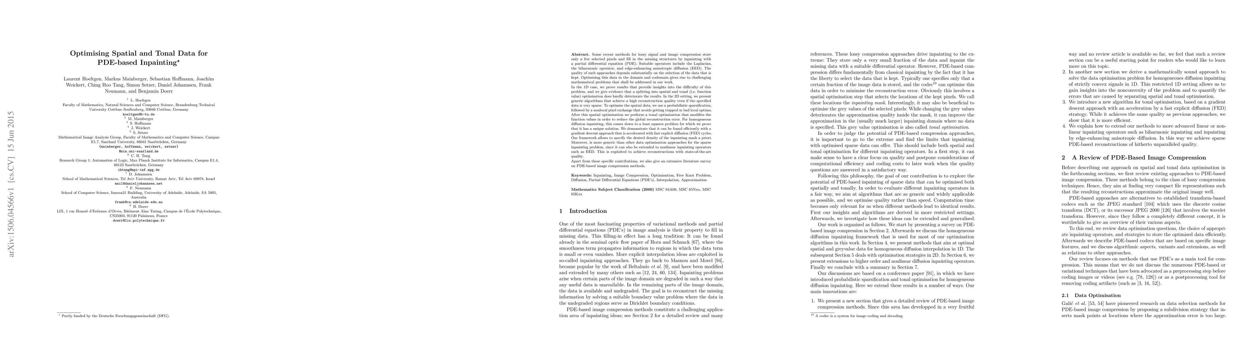 This paper proposes methods for optimizing spatial and tonal data to enhance PDE-based inpainting for lossy signal and image compression. It introduces algorithms for both 1D and 2D settings that achieve high reconstruction quality, using probabilistic sparsification and gradient descent with fast explicit diffusion cycles for optimization.