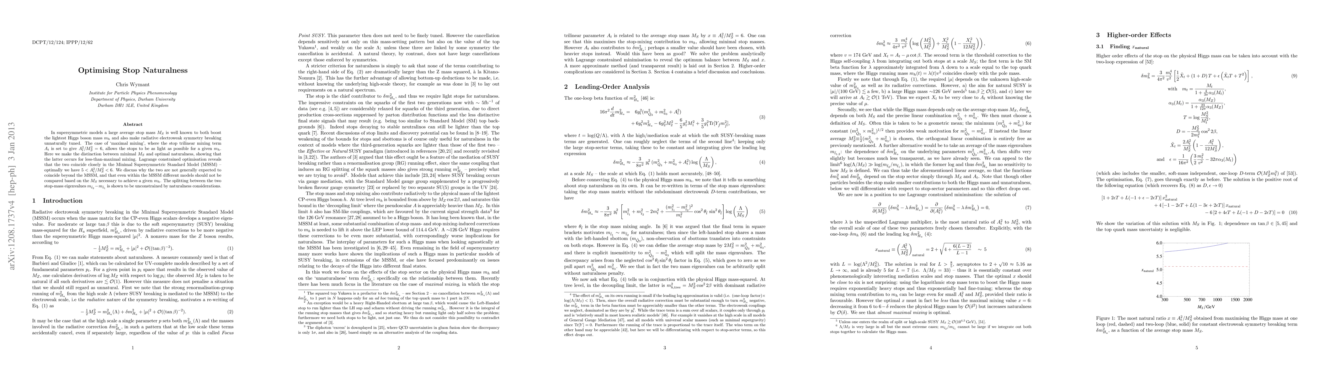 In supersymmetric models a large average stop mass $M_S$ is well known to both boost the lightest Higgs boson mass $m_{h}$ and also make radiative electroweak symmetry breaking unnaturally tuned. The case of `maximal mixing', where the stop trilinear mixing term $A_t$ is set to give $A_t^2/M_S^2 = 6$, allows the stops to be as light as possible for a given $m_h$. Here we make the distinction between minimal $M_S$ and optimal naturalness, showing that the latter occurs for less-than-maximal mixing. Lagrange constrained optimisation reveals that the two coincide closely in the Minimal Supersymmetric Standard Model (MSSM) -- optimally we have $5 < A_t^2/M_S^2 < 6$. We discuss why the two are not generally expected to coincide beyond the MSSM, and that even within the MSSM different models should not be compared based on the $M_S$ necessary to achieve a given $m_{h}$. The splitting between the two stop-mass eigenvalues $m_{\tilde{t}_2} - m_{\tilde{t}_1}$ is shown to be unconstrained by naturalness considerations.