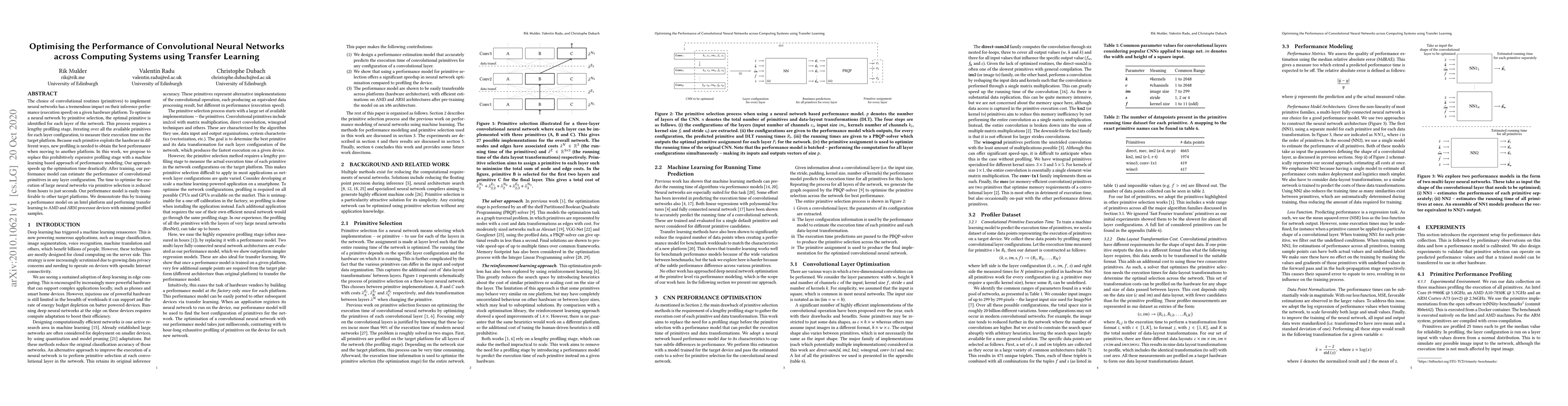This research proposes a machine learning approach to optimize convolutional neural network performance across different computing systems, replacing time-consuming profiling with a transferable performance model. It drastically reduces optimization time from hours to seconds, demonstrating successful transfer learning from Intel to AMD and ARM processors with minimal profiled samples.