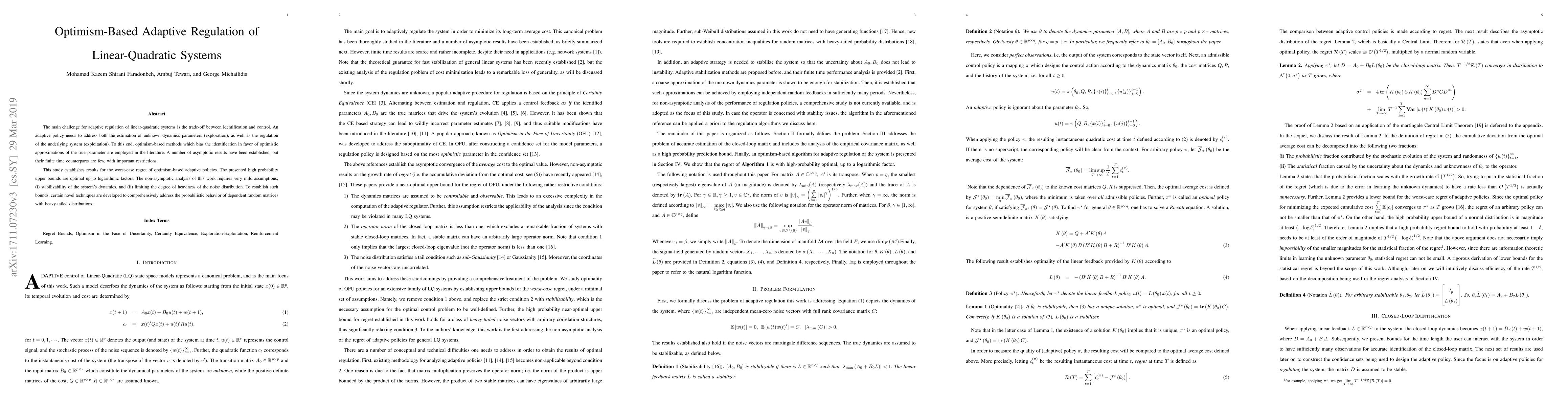 The main challenge for adaptive regulation of linear-quadratic systems is the trade-off between identification and control. An adaptive policy needs to address both the estimation of unknown dynamics parameters (exploration), as well as the regulation of the underlying system (exploitation). To this end, optimism-based methods which bias the identification in favor of optimistic approximations of the true parameter are employed in the literature. A number of asymptotic results have been established, but their finite time counterparts are few, with important restrictions. This study establishes results for the worst-case regret of optimism-based adaptive policies. The presented high probability upper bounds are optimal up to logarithmic factors. The non-asymptotic analysis of this work requires very mild assumptions; (i) stabilizability of the system's dynamics, and (ii) limiting the degree of heaviness of the noise distribution. To establish such bounds, certain novel techniques are developed to comprehensively address the probabilistic behavior of dependent random matrices with heavy-tailed distributions.