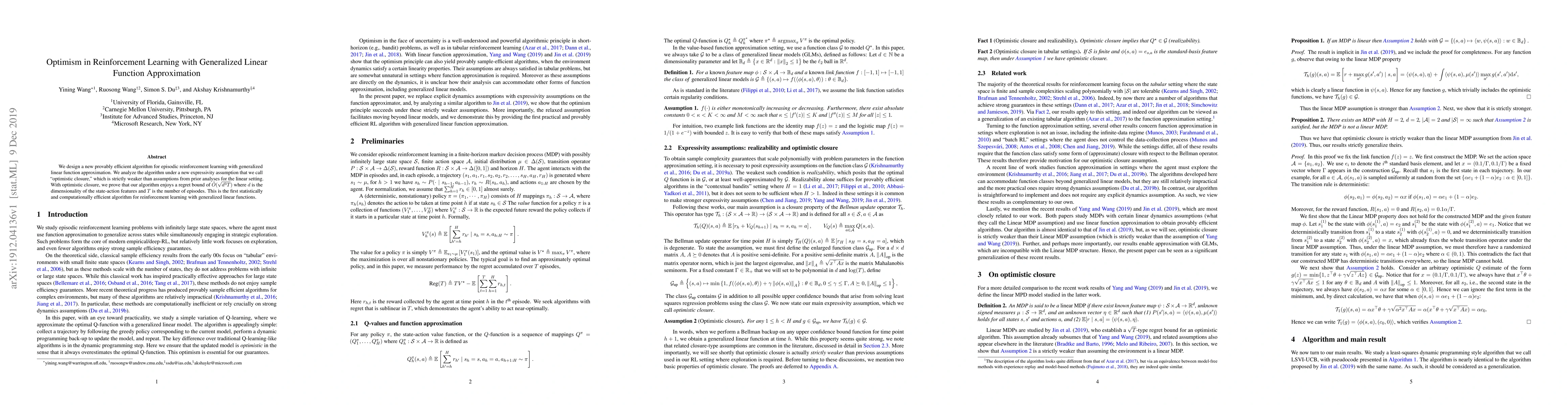 This paper introduces a new efficient reinforcement learning algorithm with generalized linear function approximation, proving a regret bound of $\tilde{O}(\sqrt{d^3 T})$ under an "optimistic closure" assumption, which is less restrictive than previous linear setting assumptions. This marks the first algorithm that is both statistically and computationally efficient for this context.